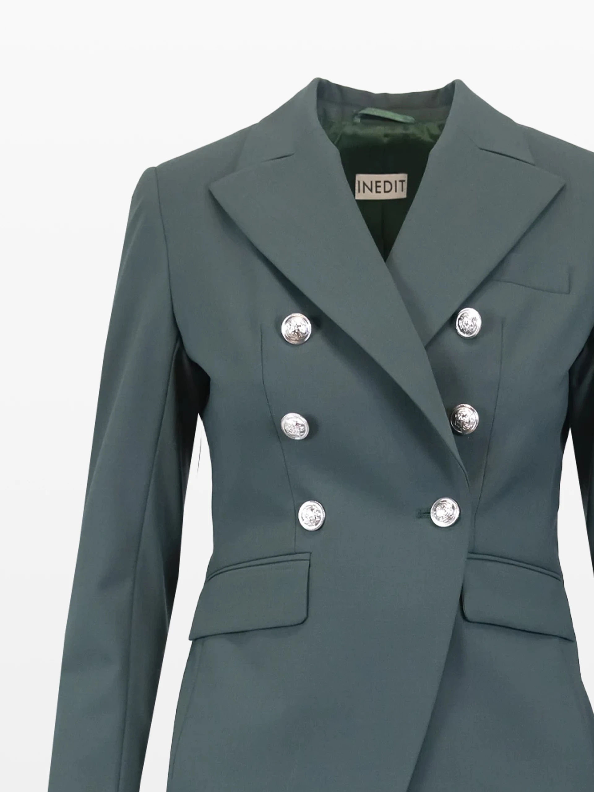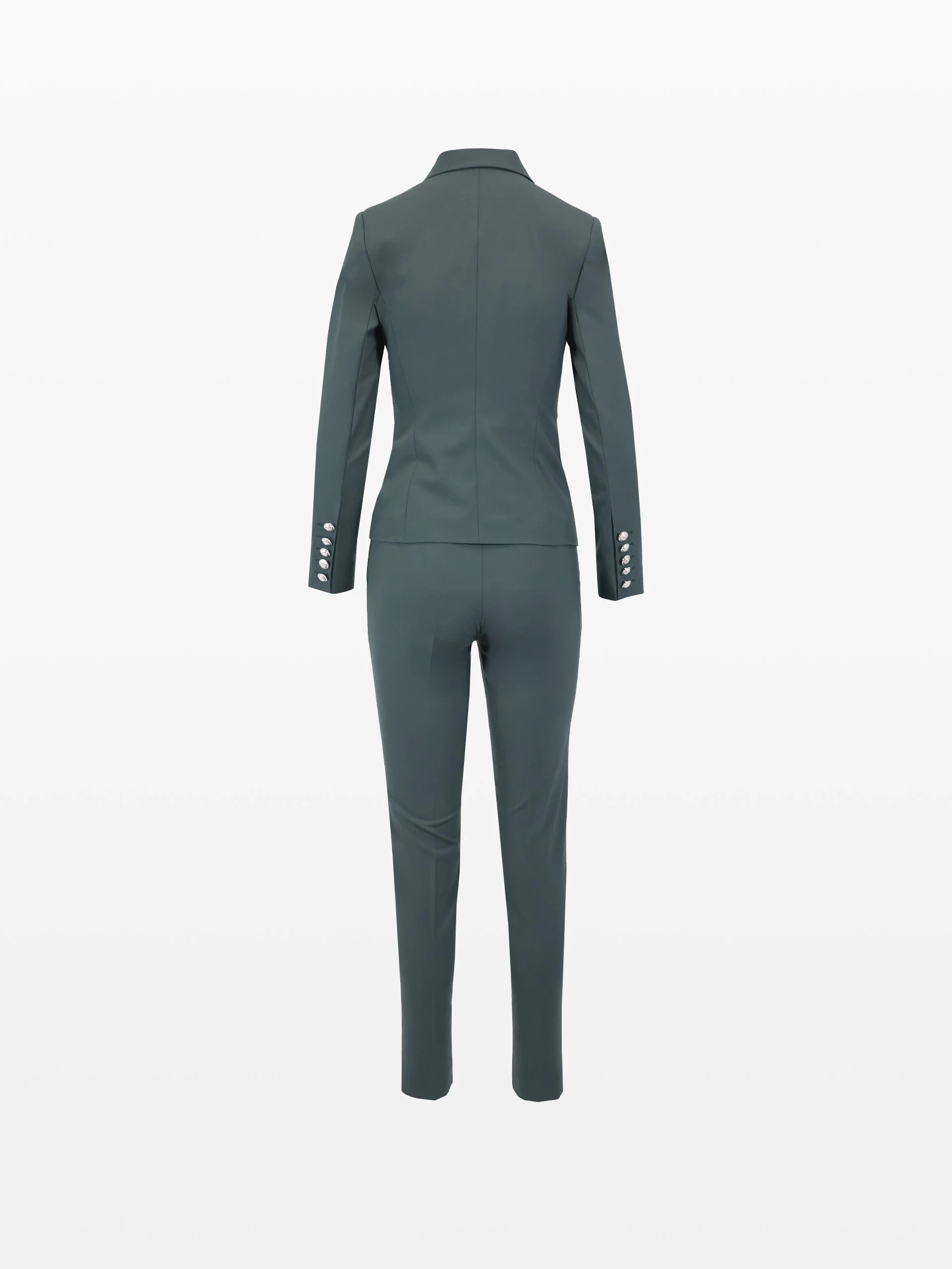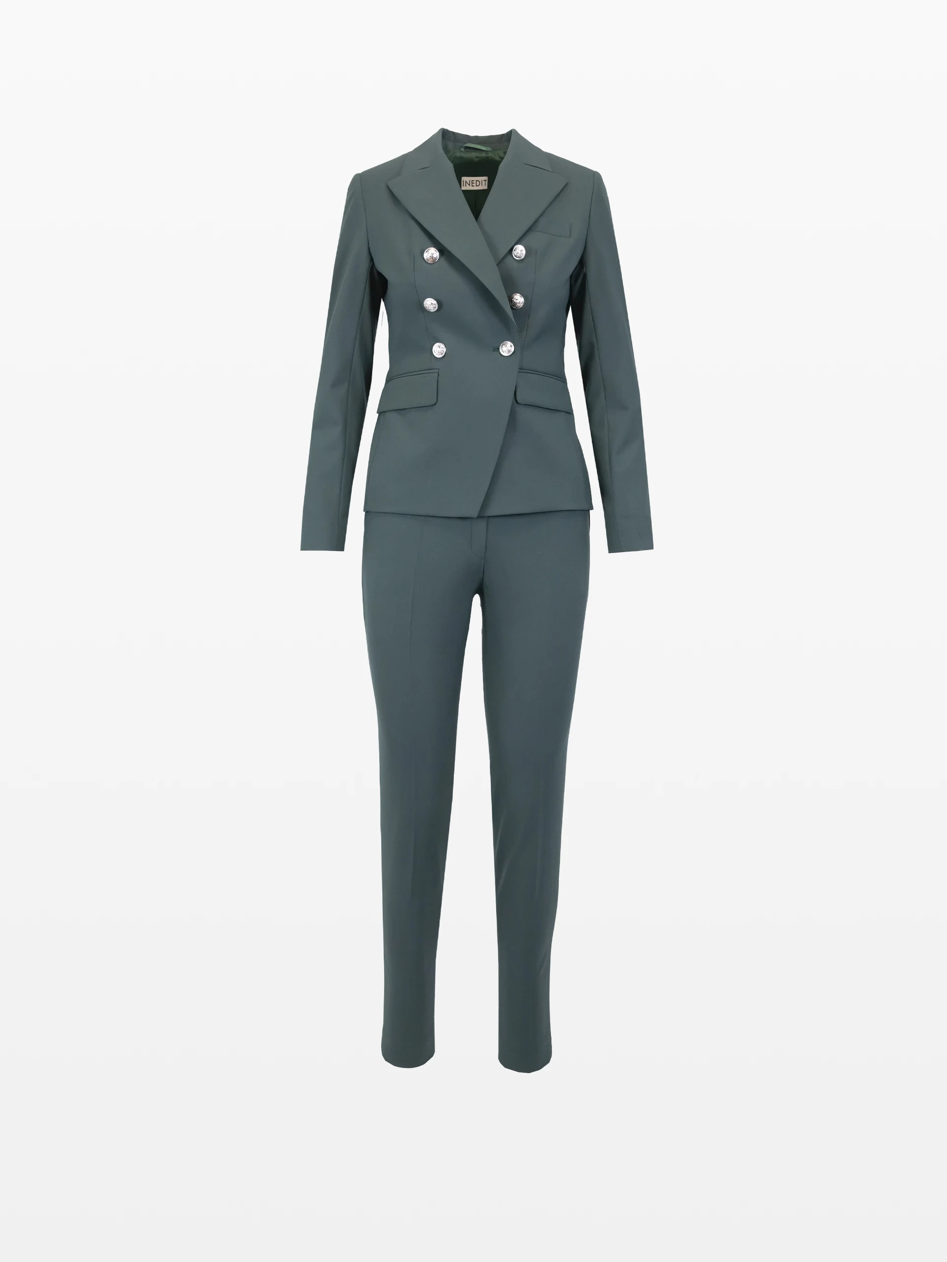 Costum femei, pantaloni și sacou cu 2 rânduri de nasturi din stofă verde. Coriala acestui costum este slim fit.