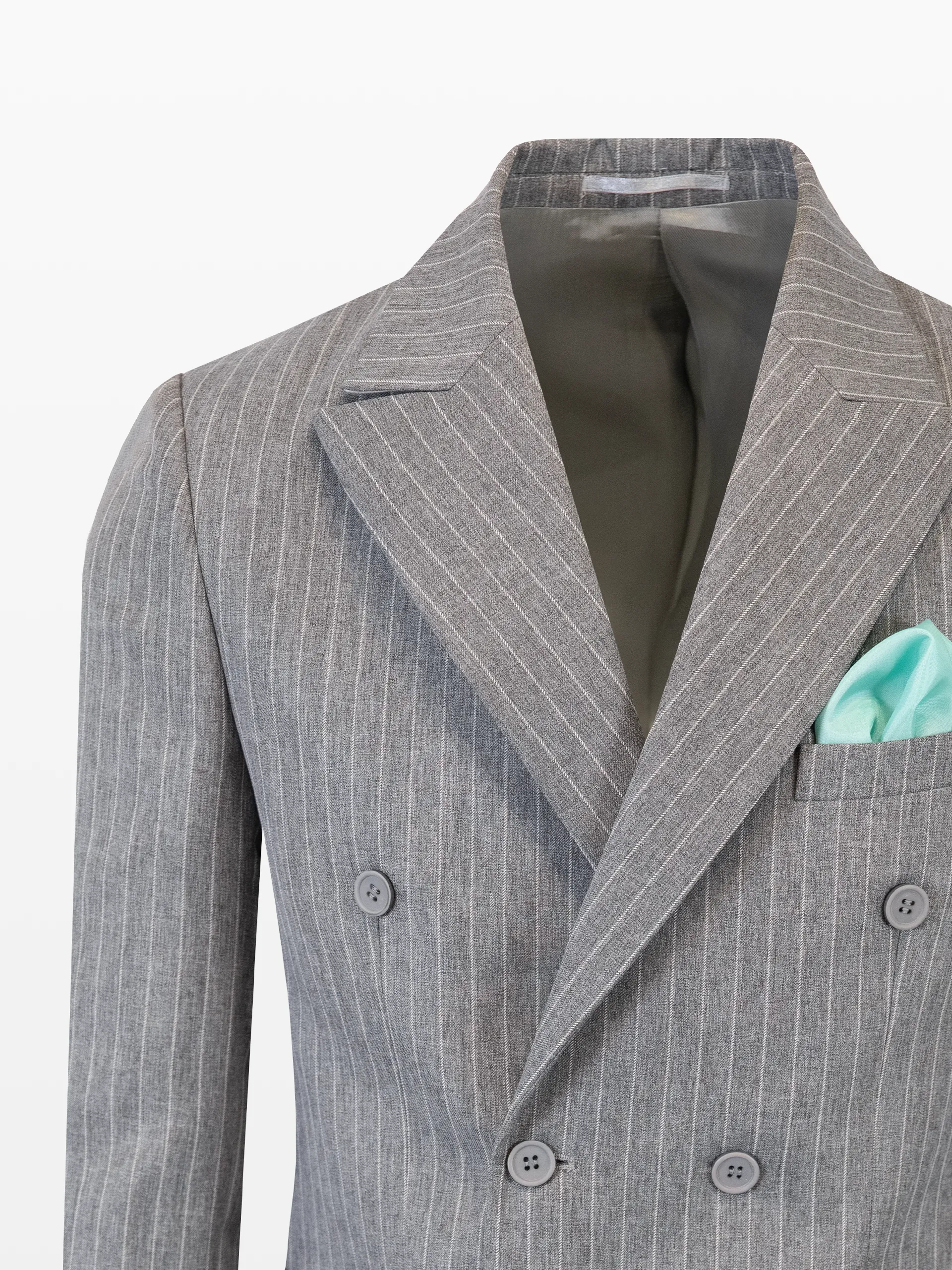 Sacou cu două rânduri de nasturi și pantaloni din stofă culoarea gri cu dungi albe.