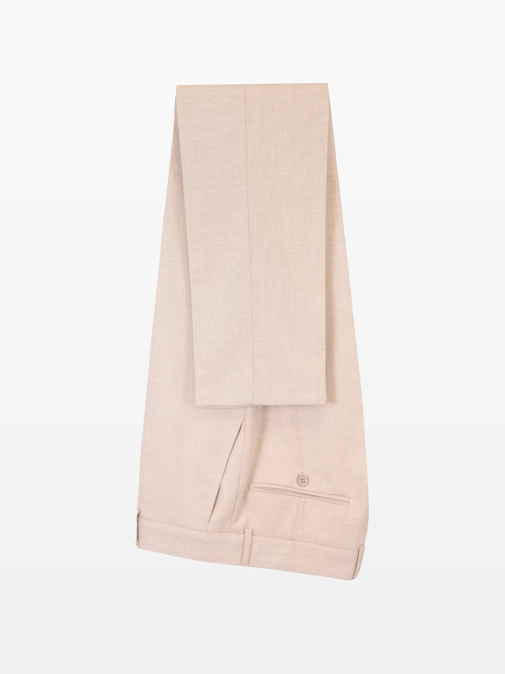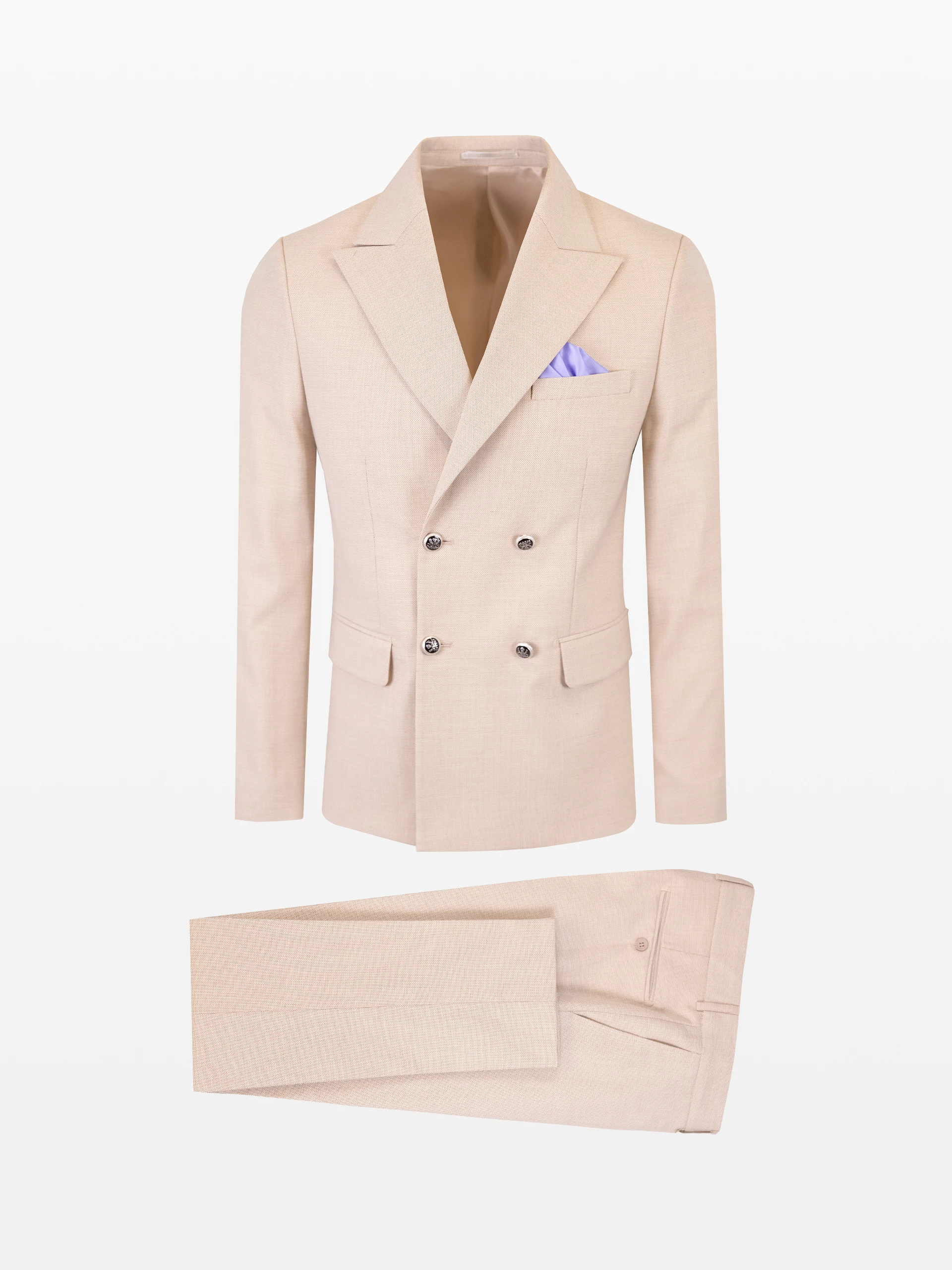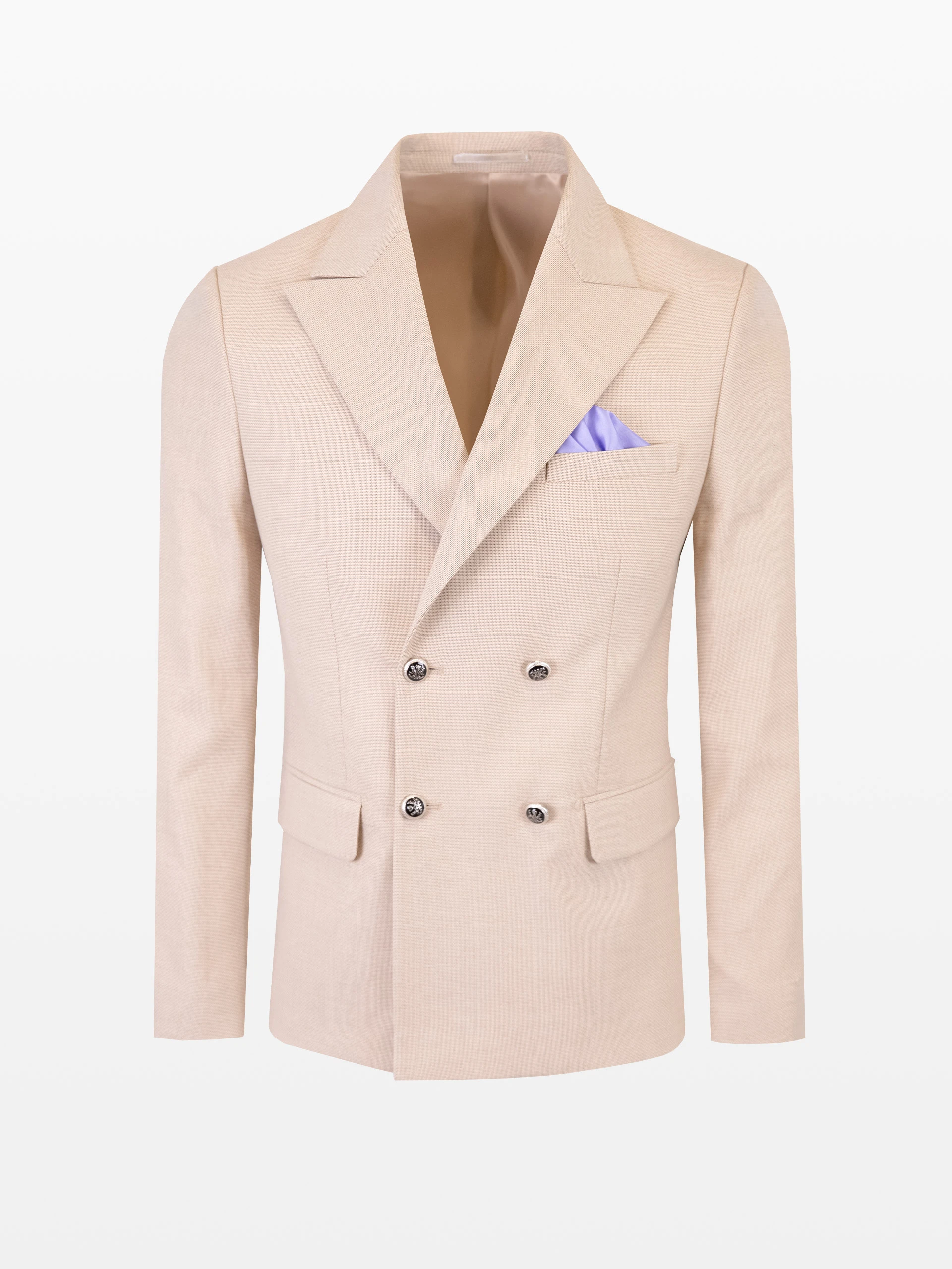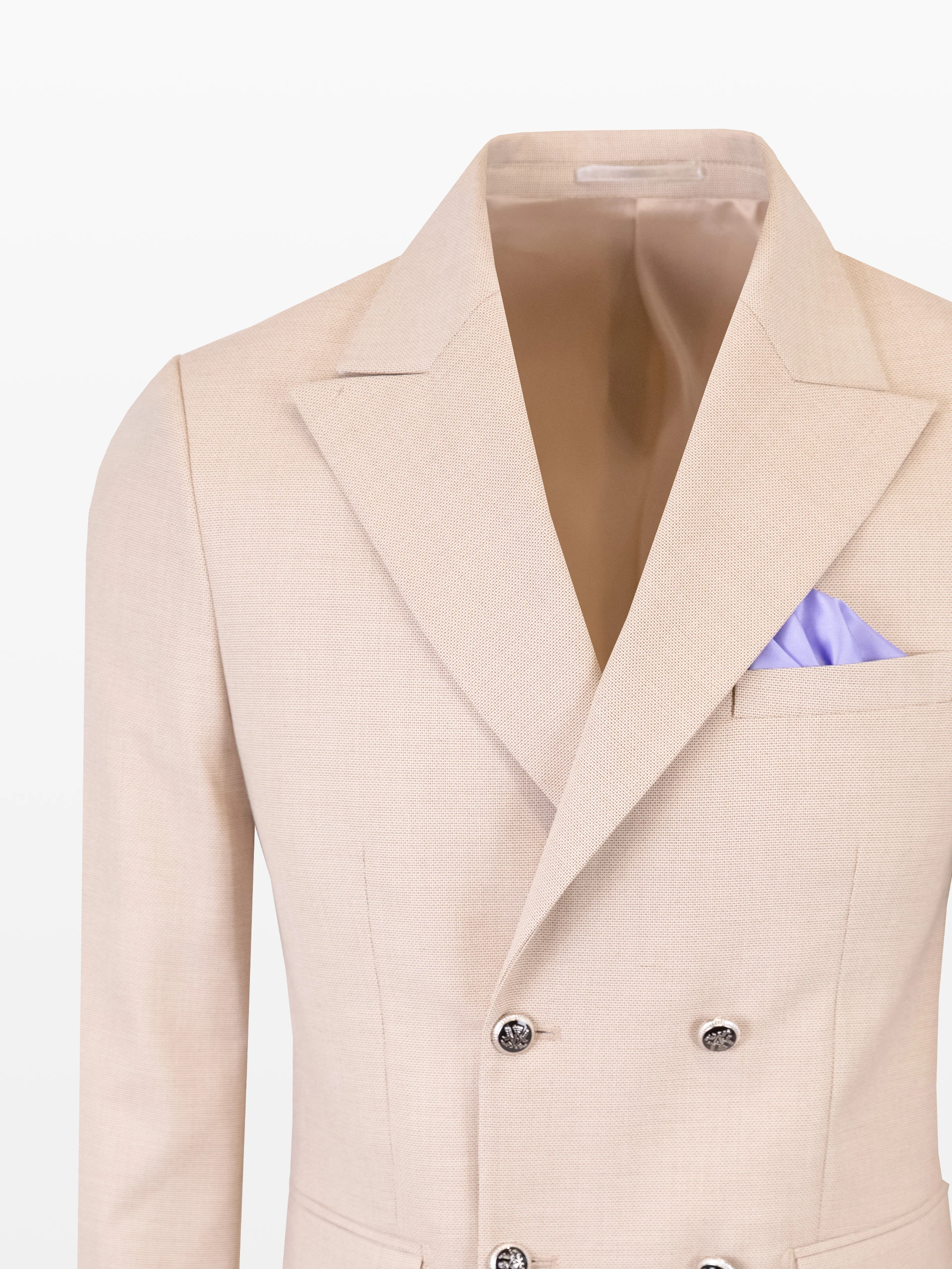 Sacou cu două rânduri de nasturi și pantaloni din stofă culoarea crem texturat.