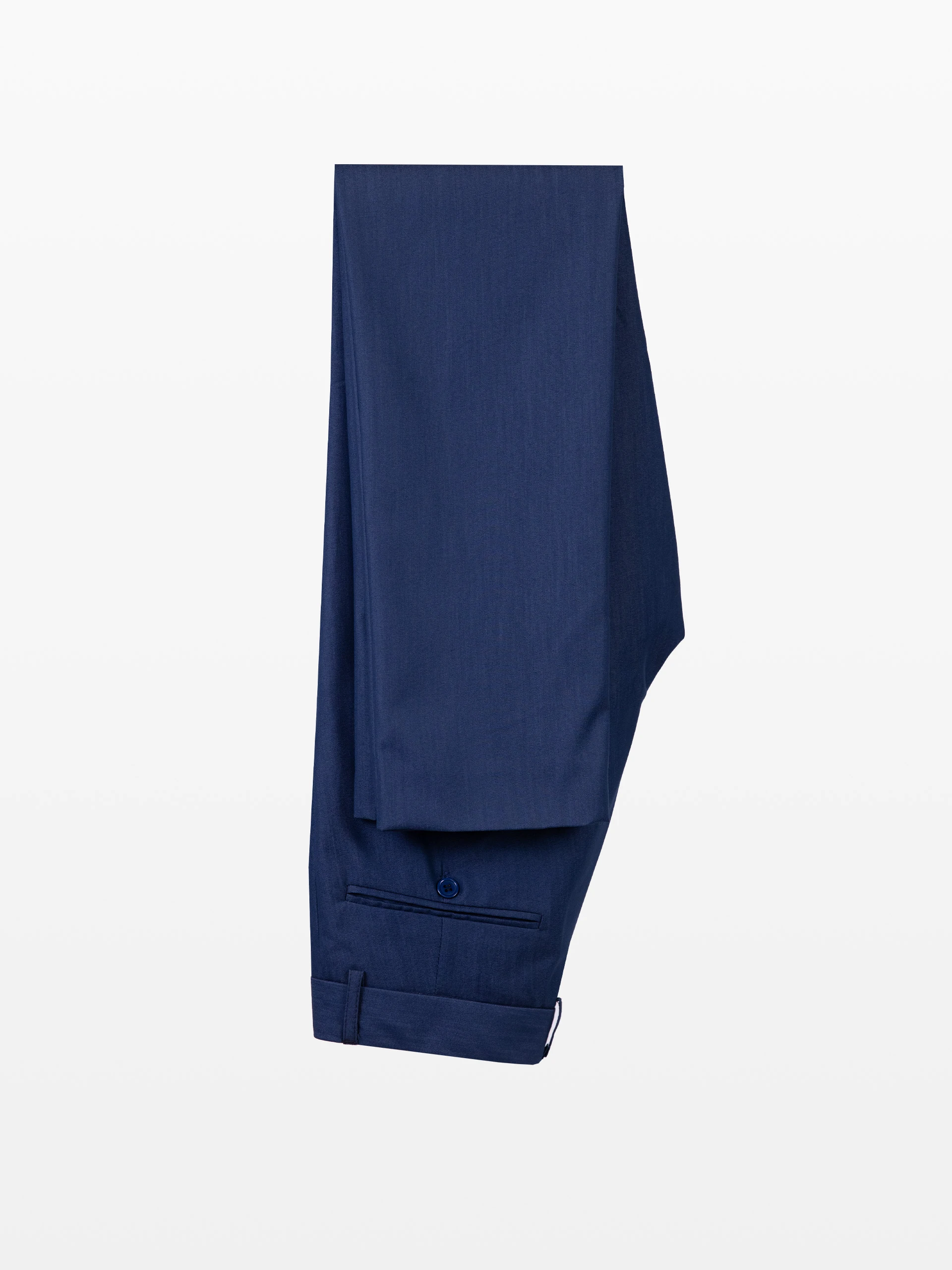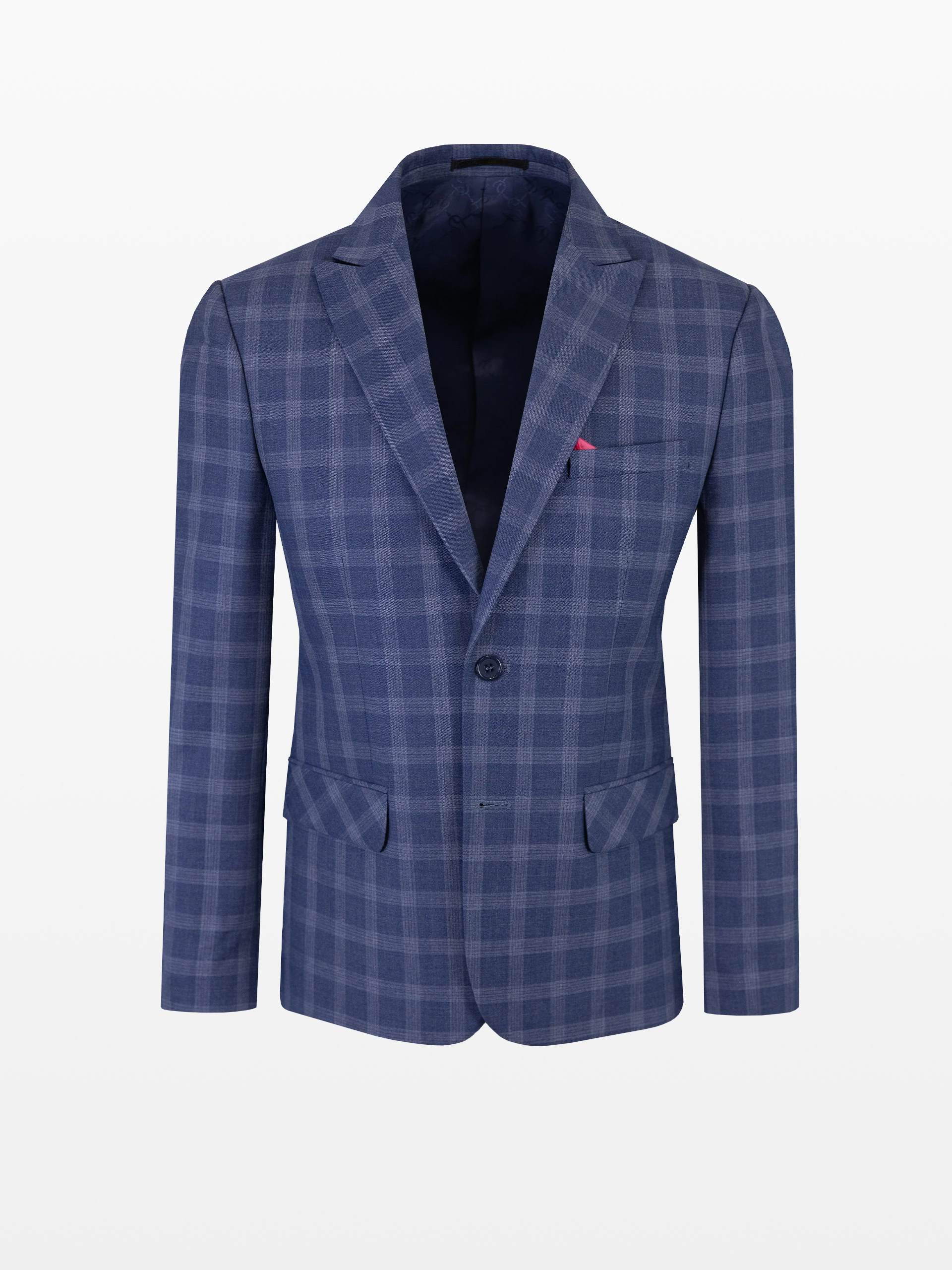 Sacou din stofa bleumarin in carouri și pantaloni din uni albastru închis.