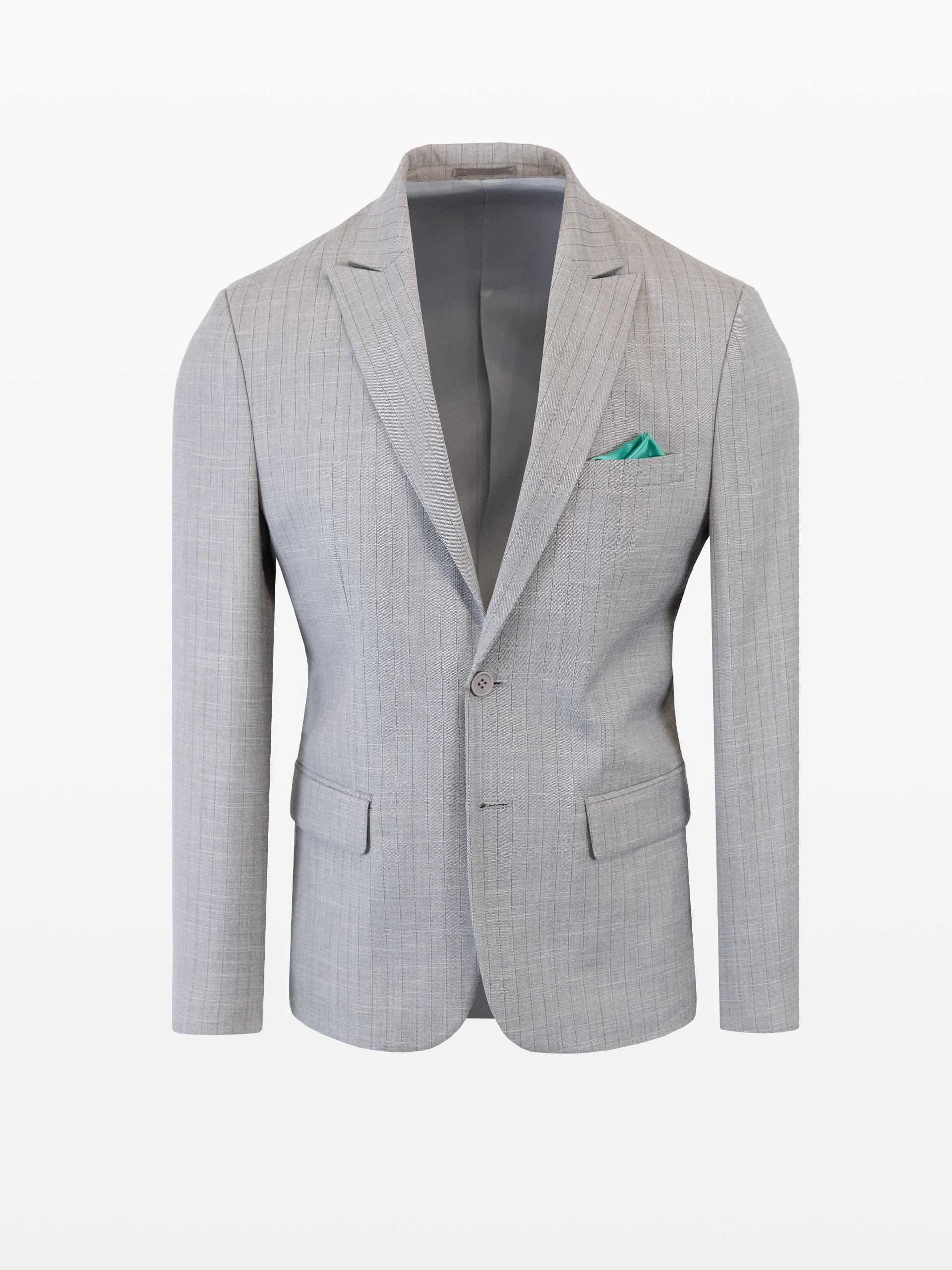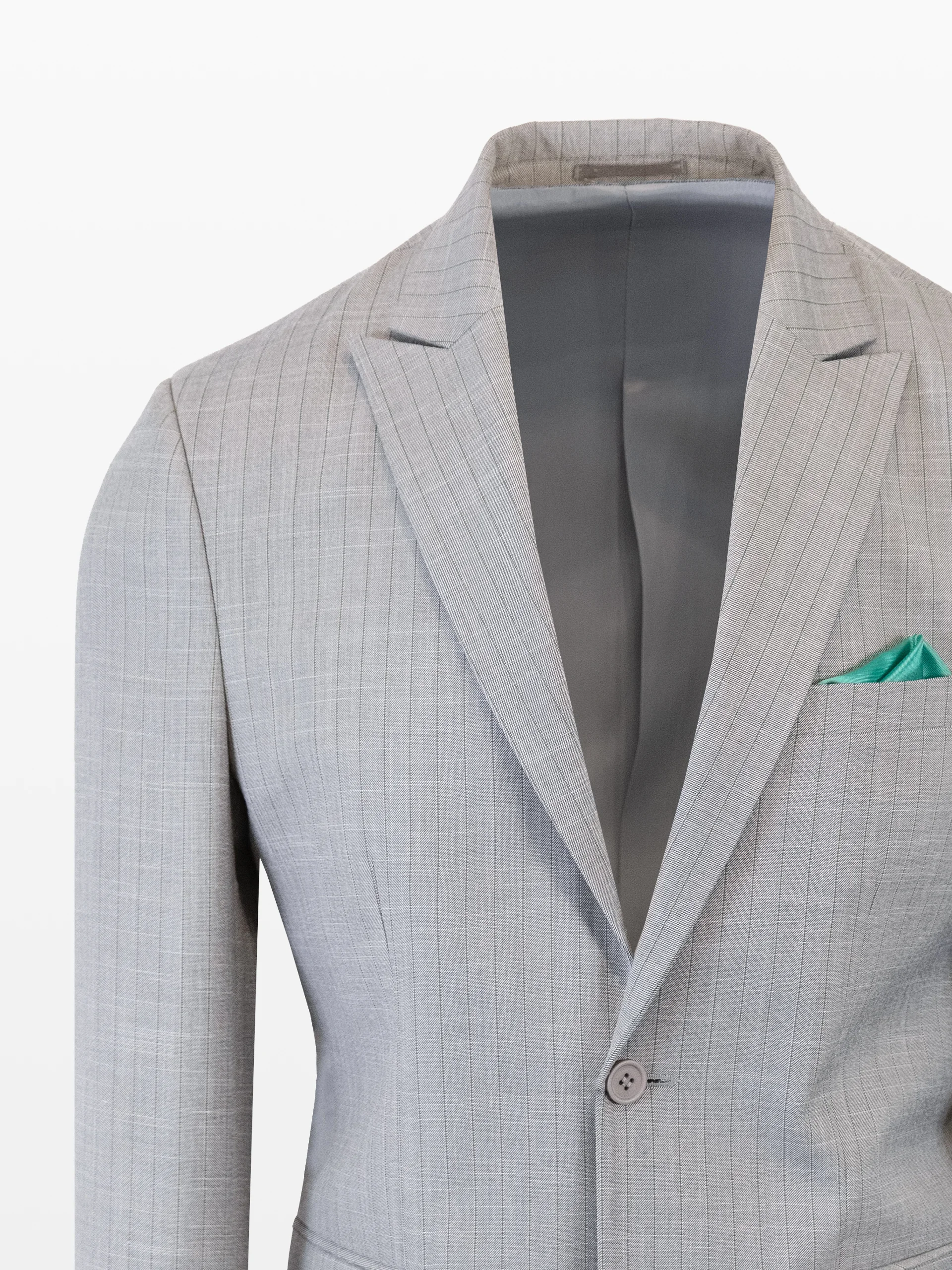 Sacou din stofă gri cu dungi și pantaloni stofă culoarea gri.