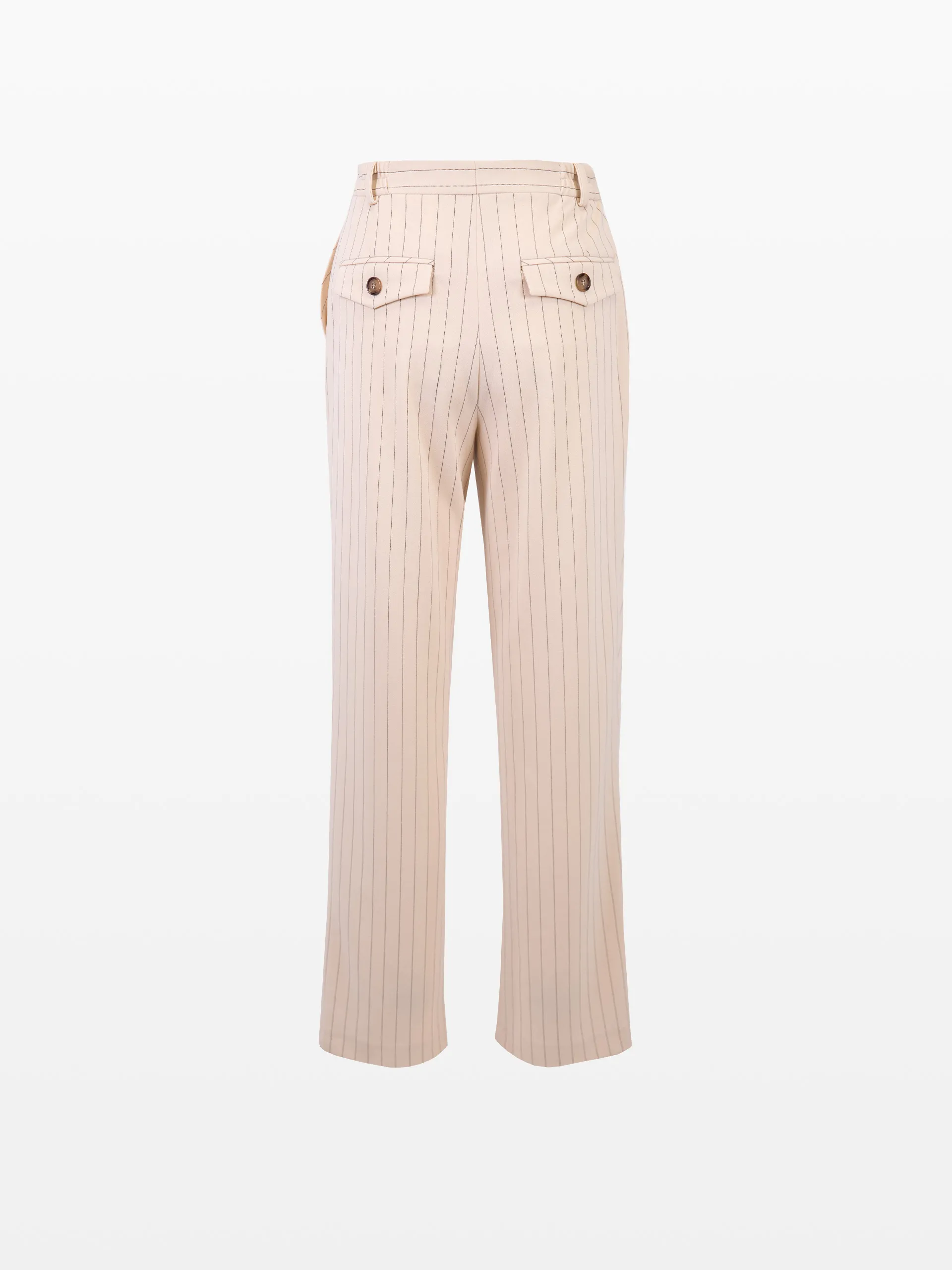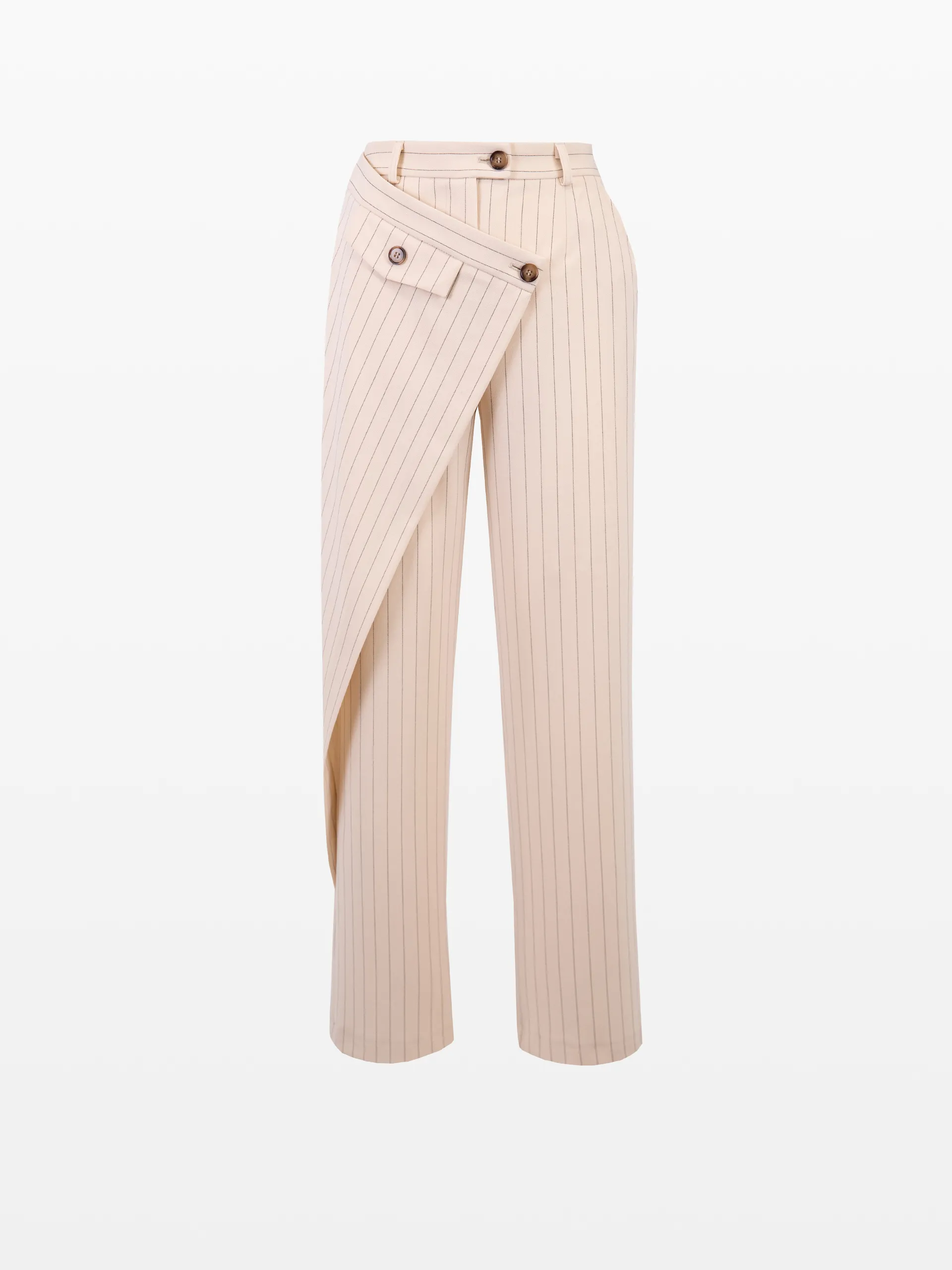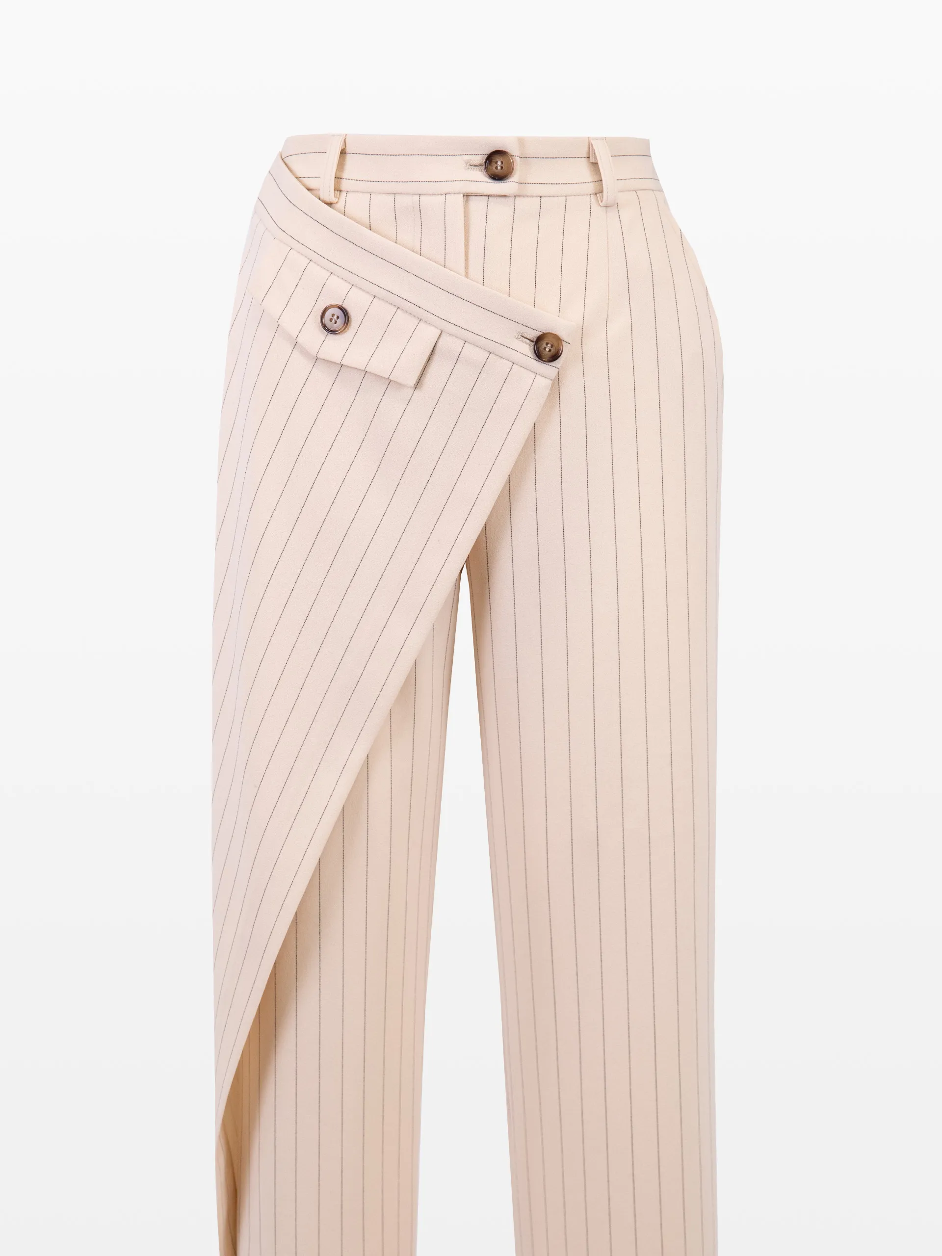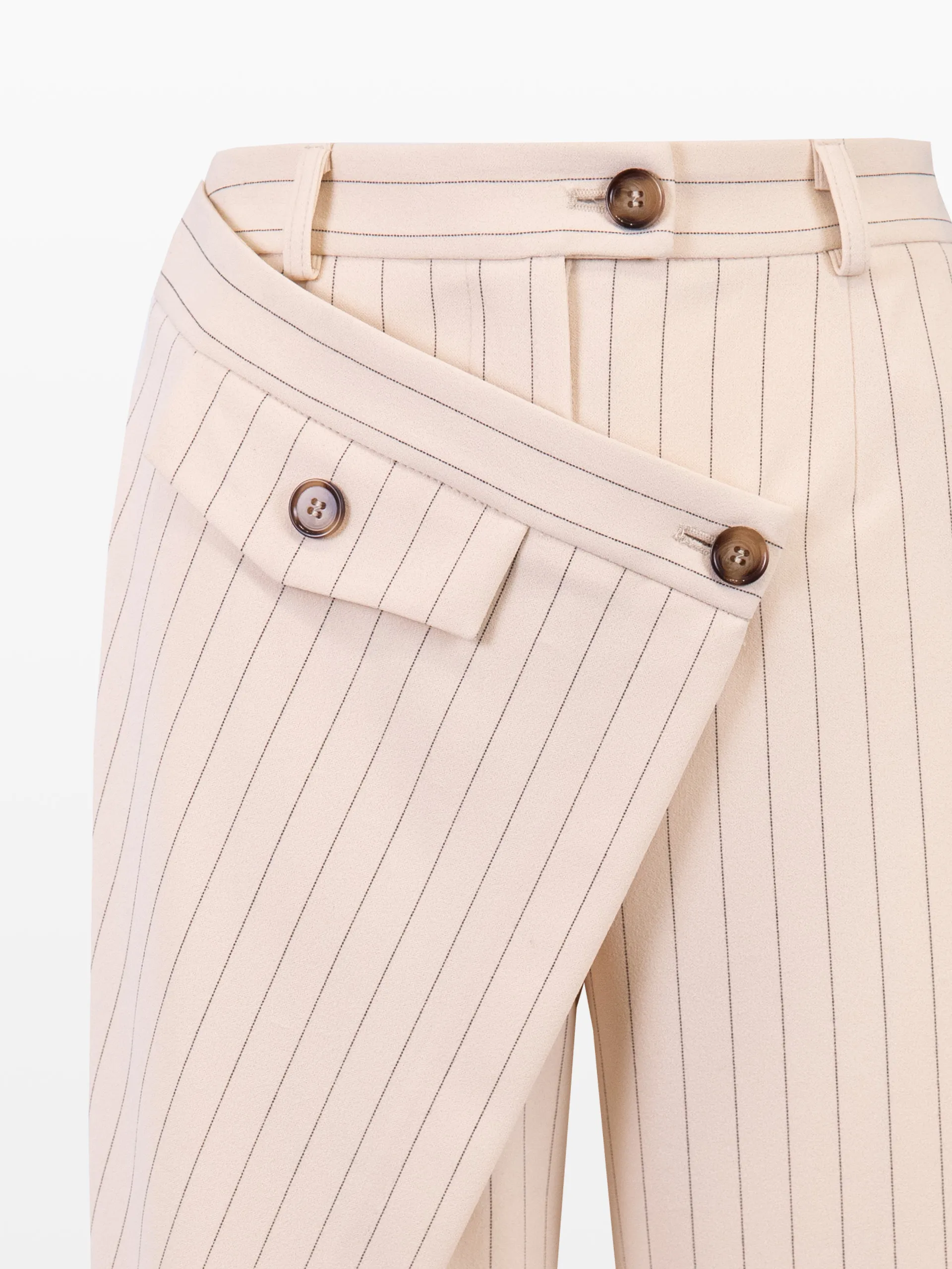 Pantalon asimetric, culoarea bej cu dungi.