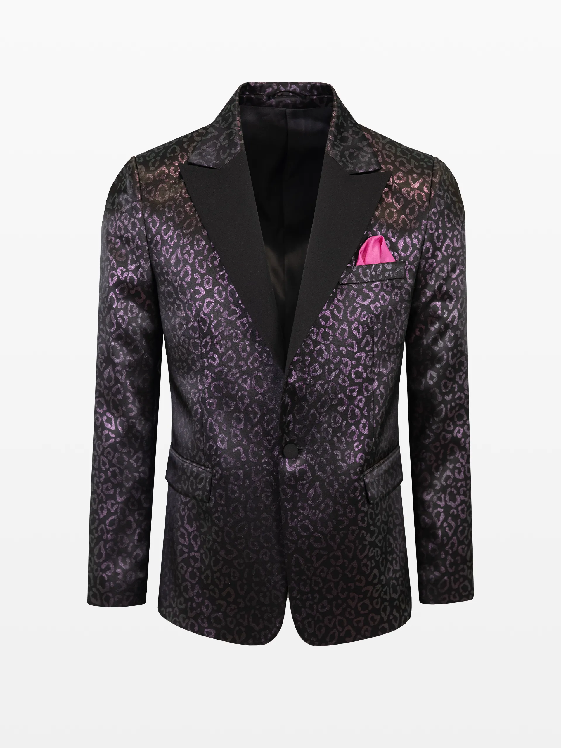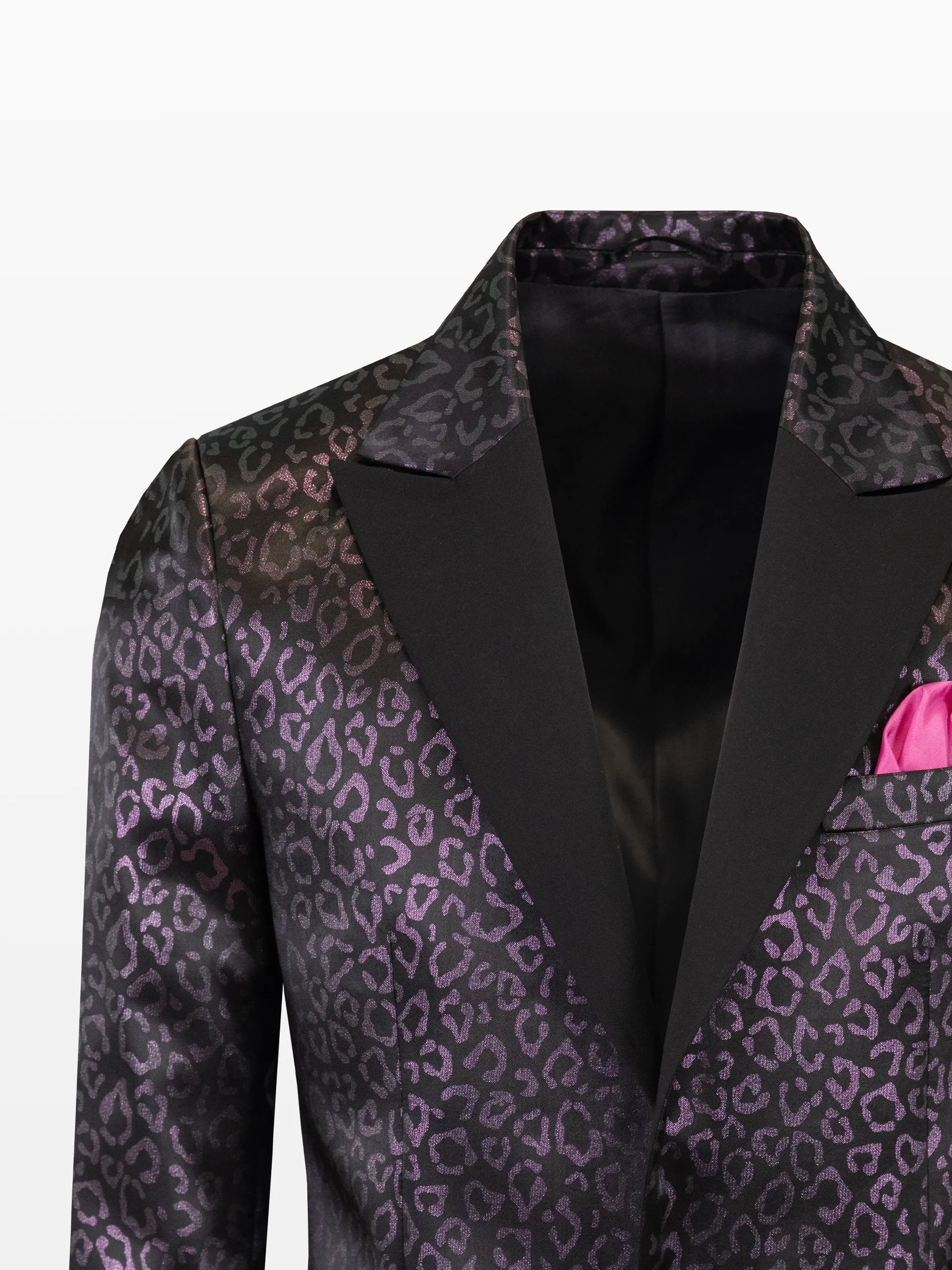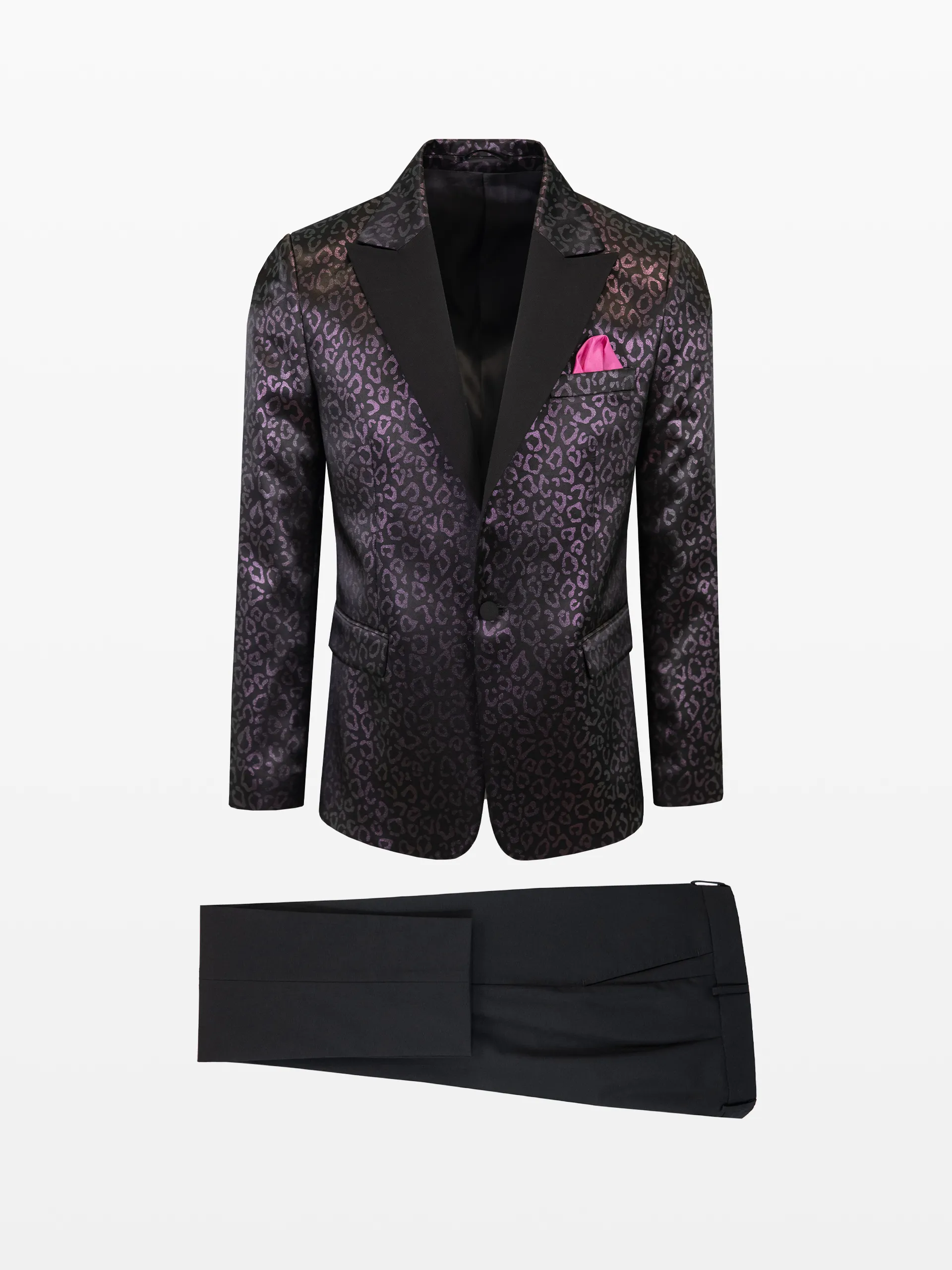 Sacou cu rever ascuțit (peak lapel) negru, stofă print animal negru/mov, cu prindere în doi nasturi și pantaloni din stofă culoarea uni neagră.