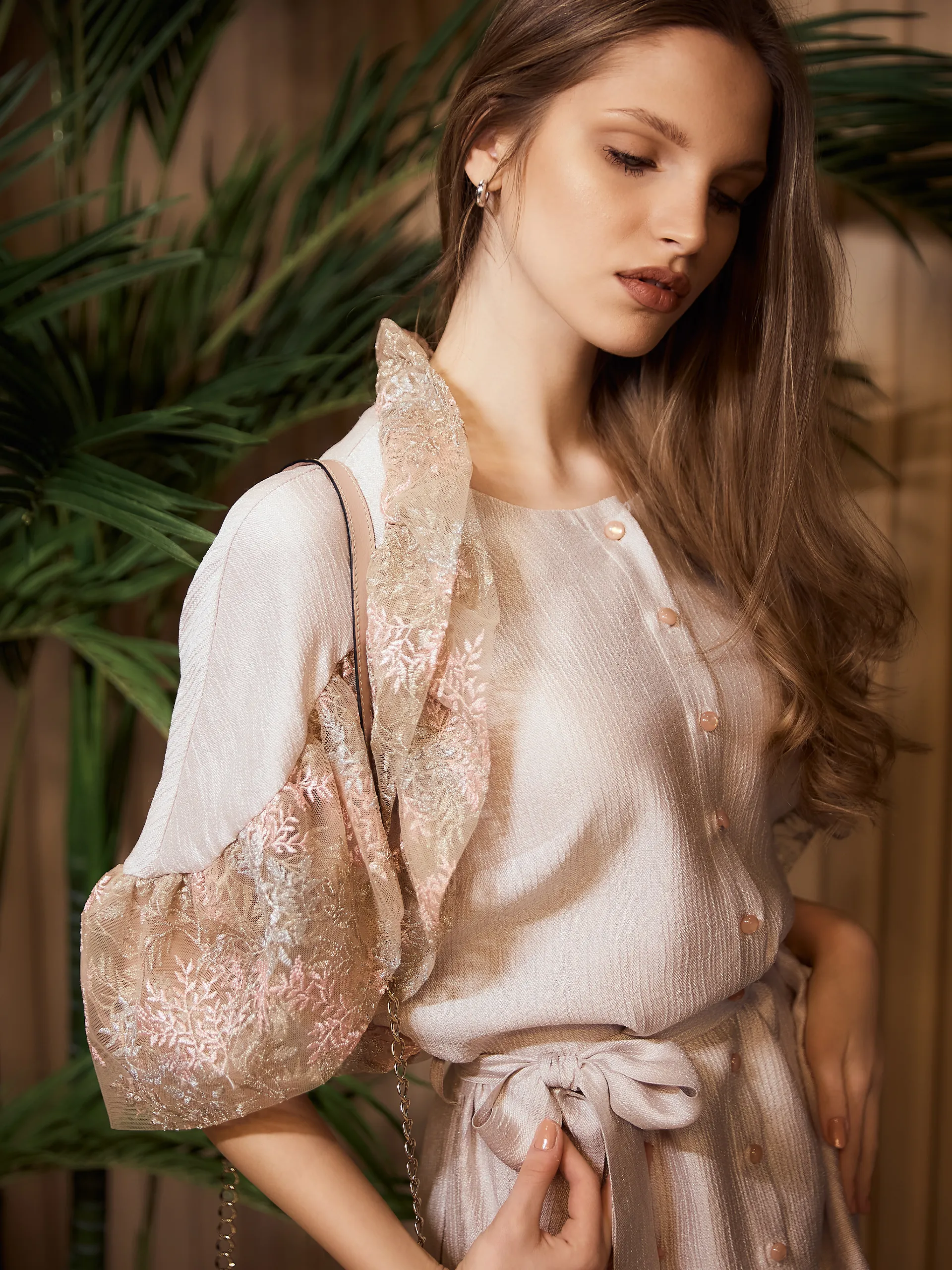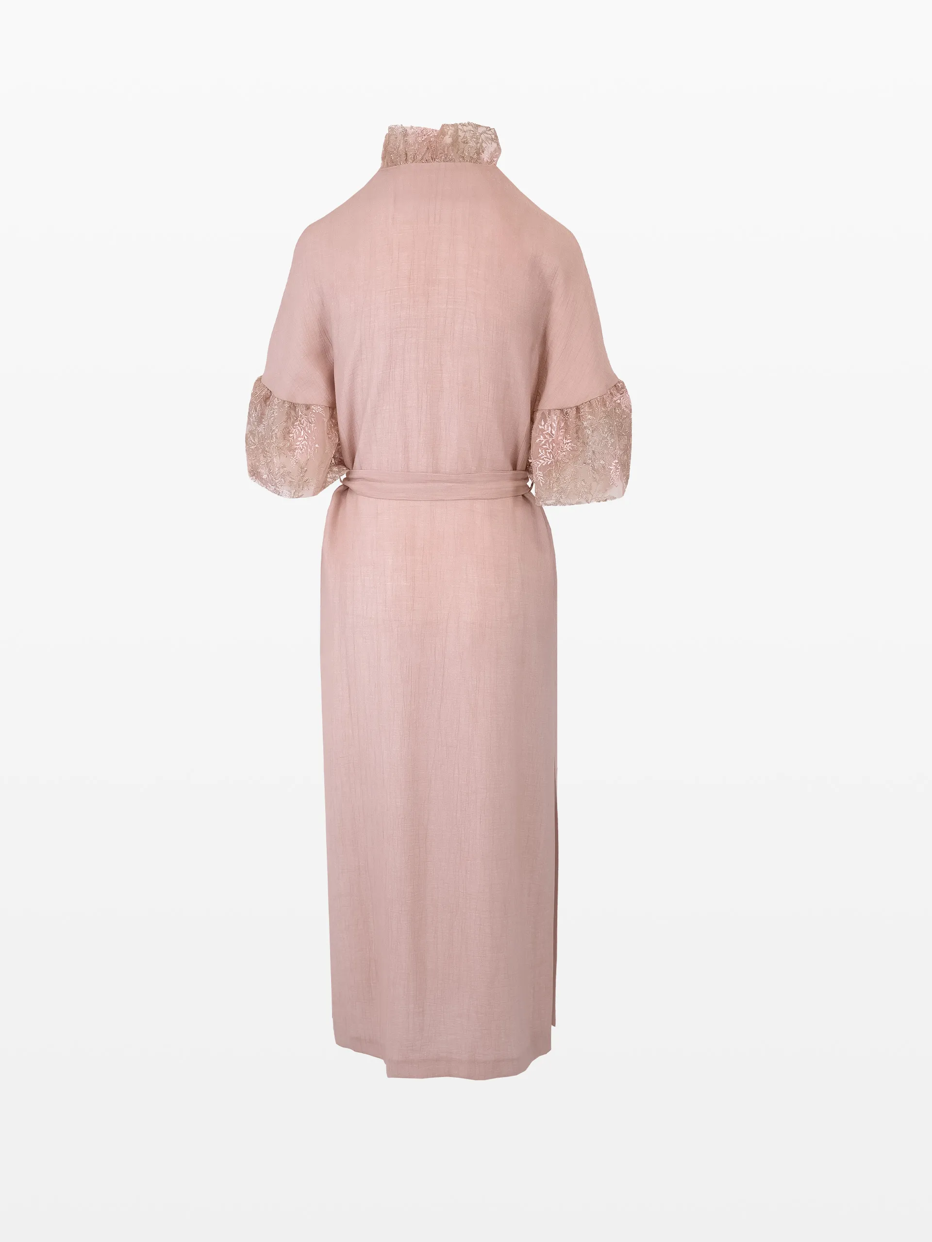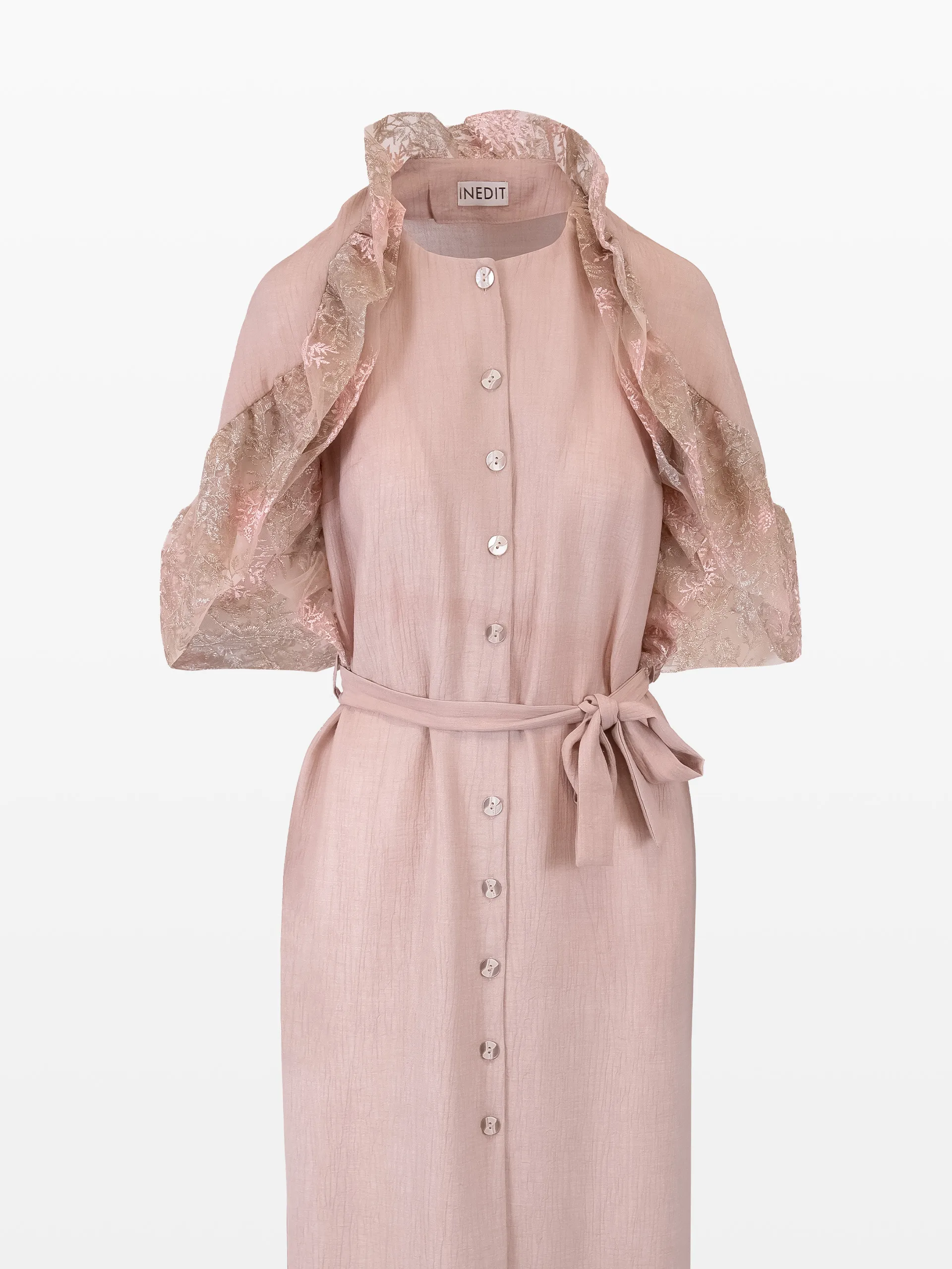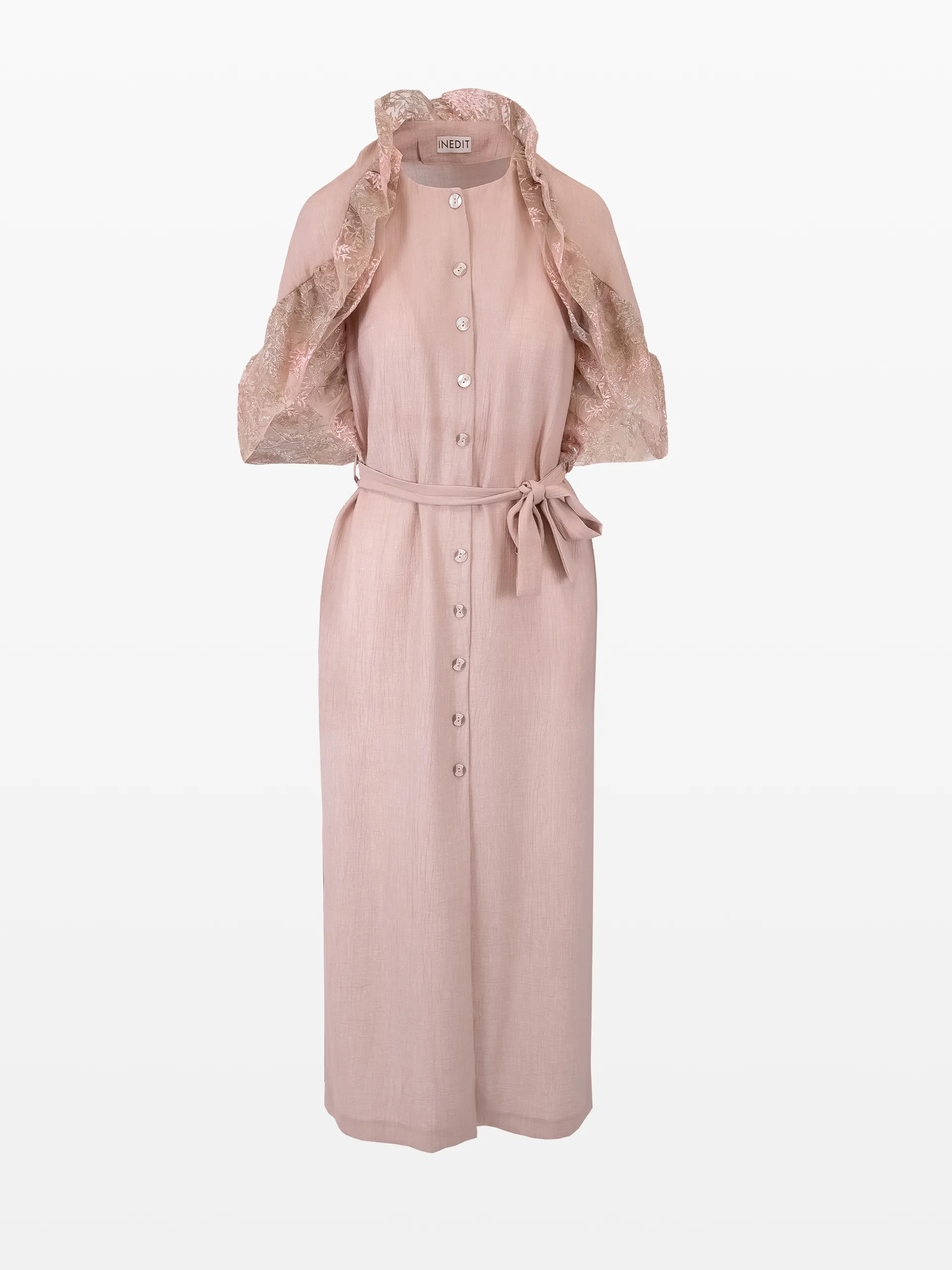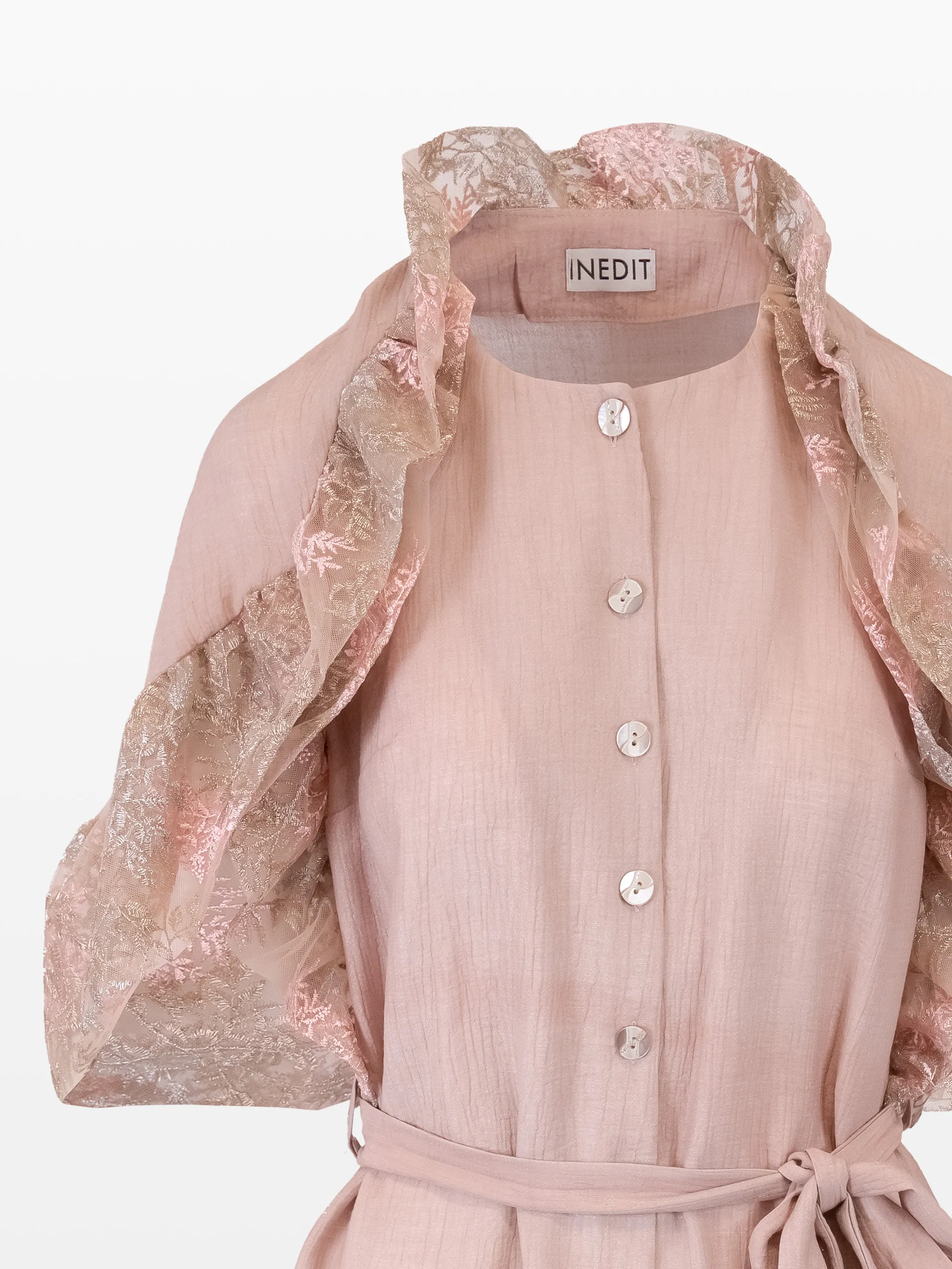 Rochie tip cămașă roz lungă, cu volane din dantelă.