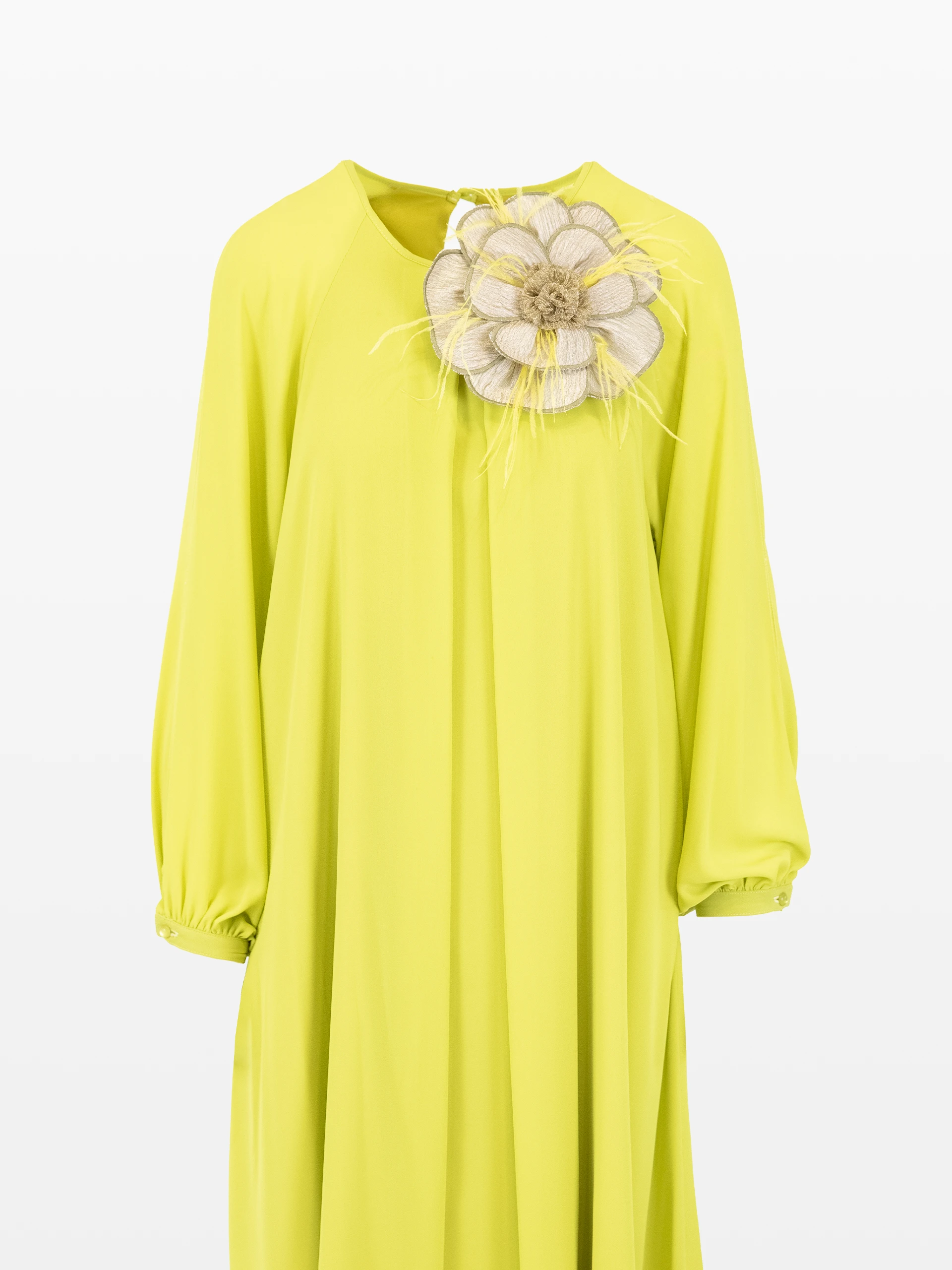 Rochie cocktail lejeră, culoarea galbenă cu broșă de flori.