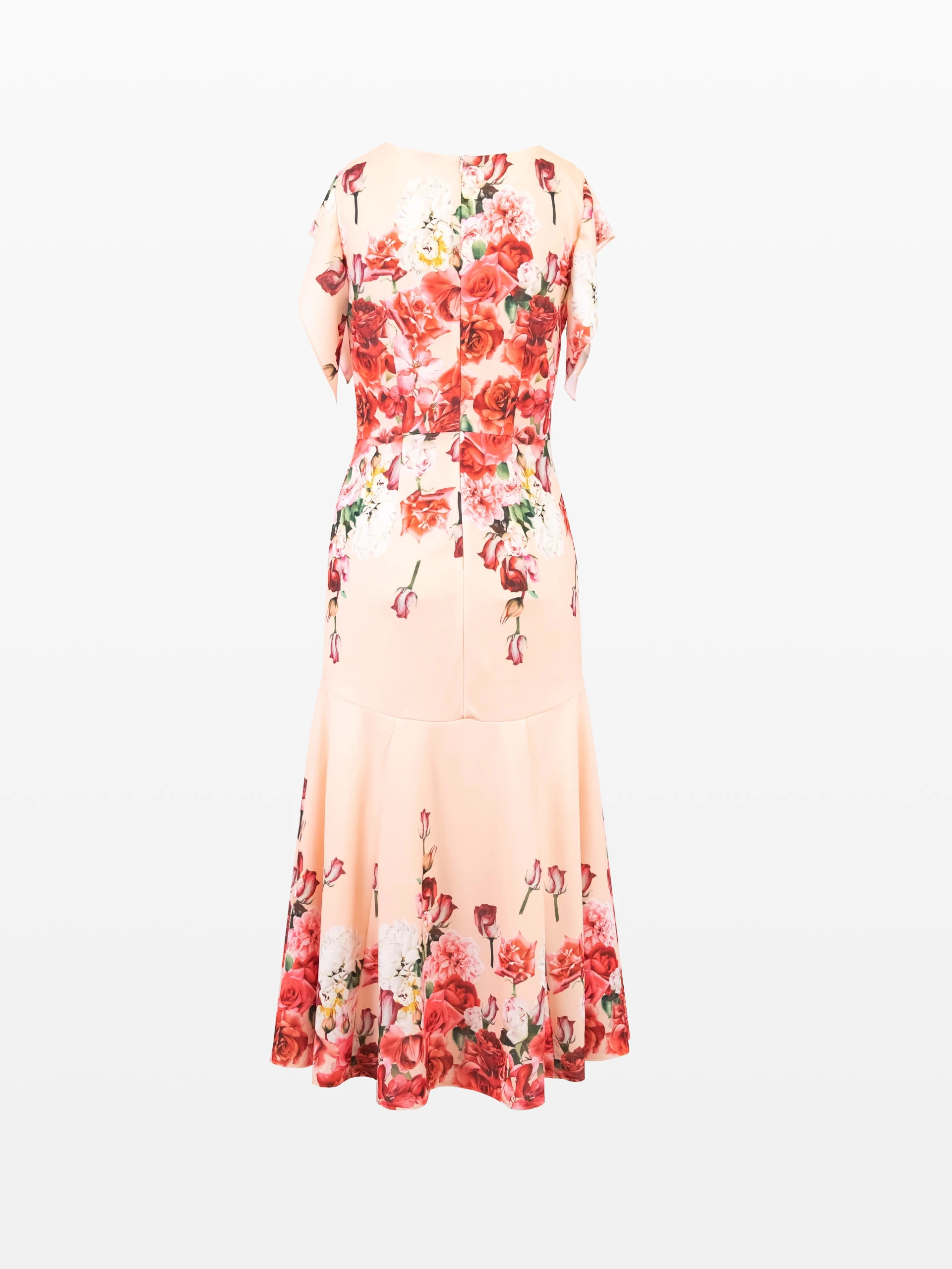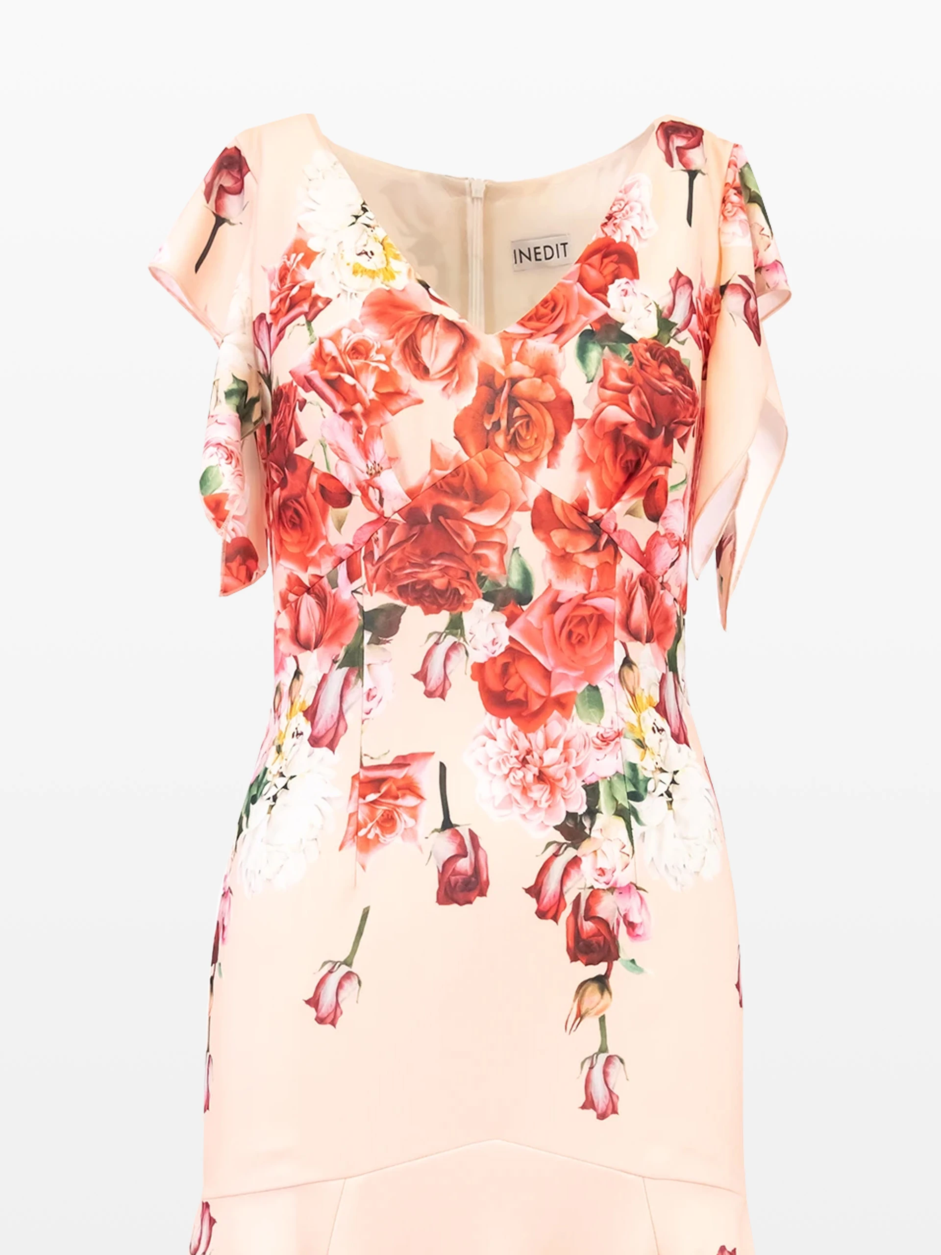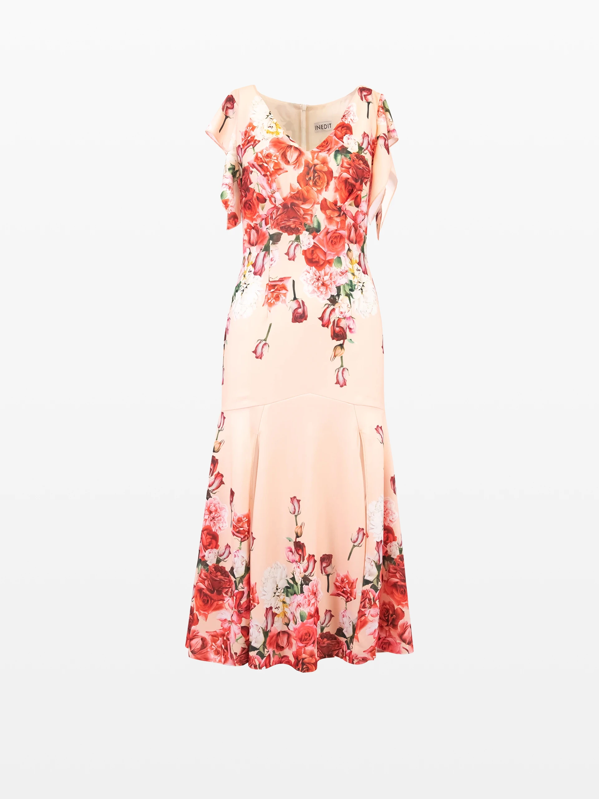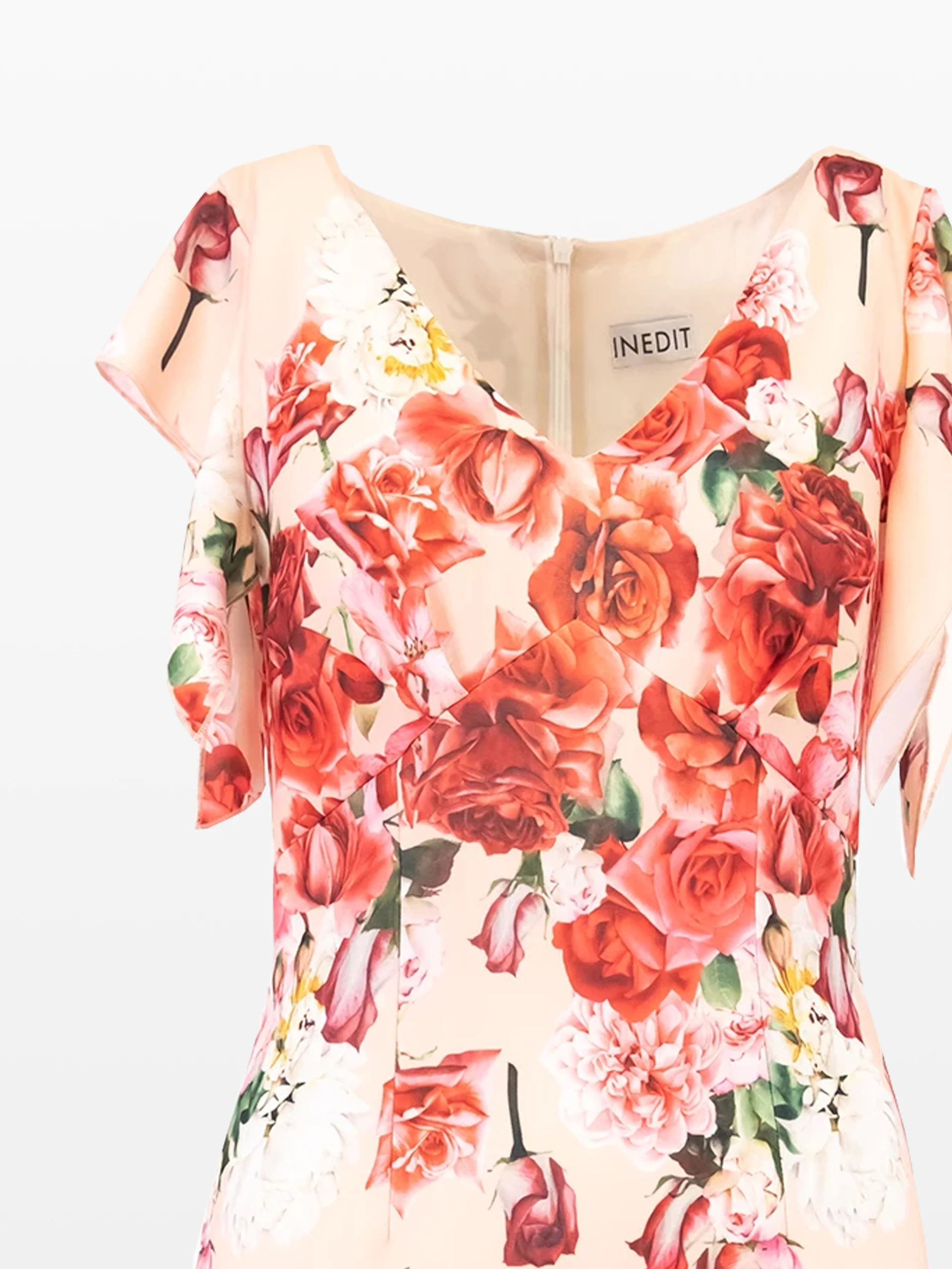 Rochie midi cu print floral, cu 2 slițuri pe față.