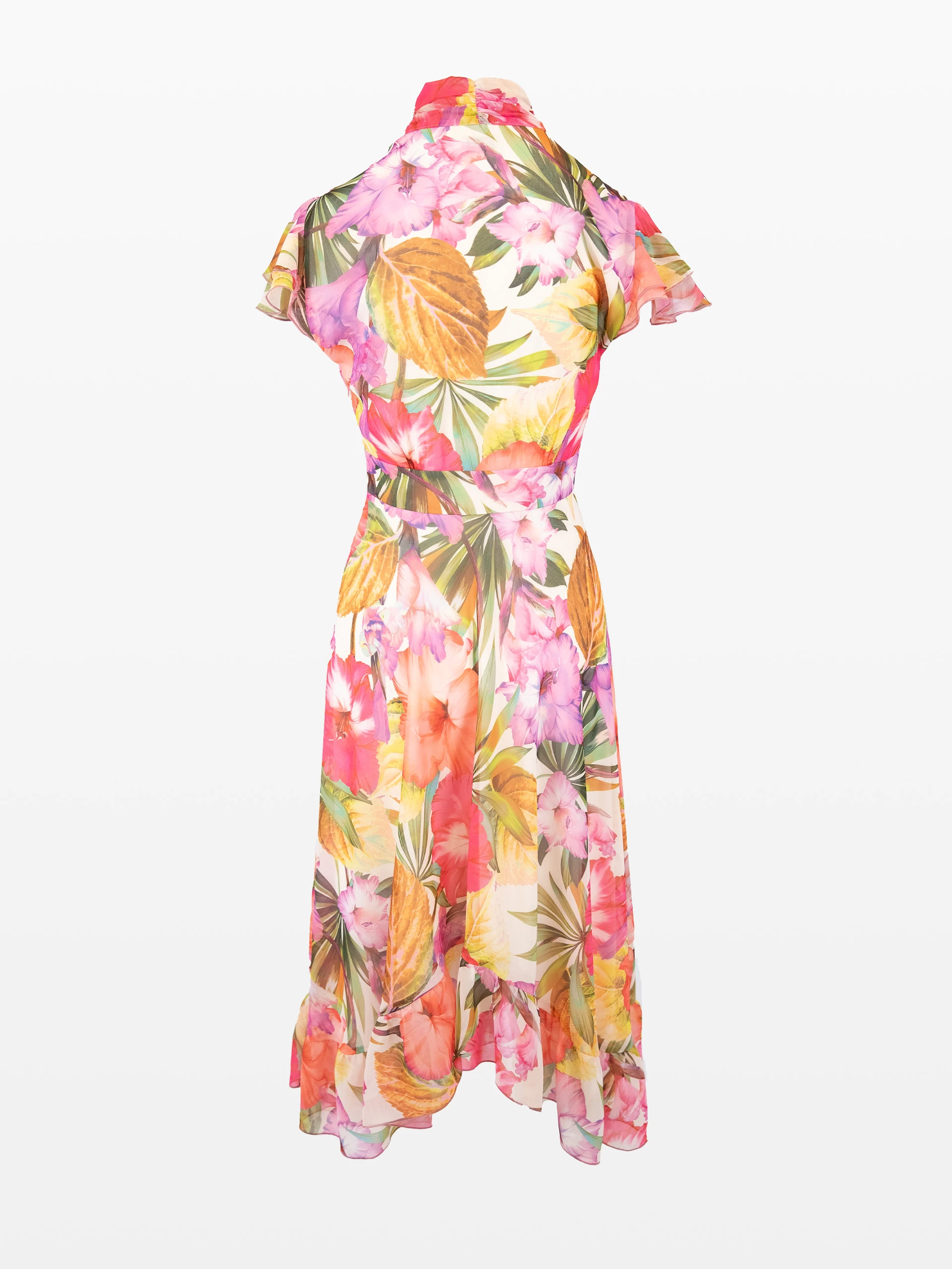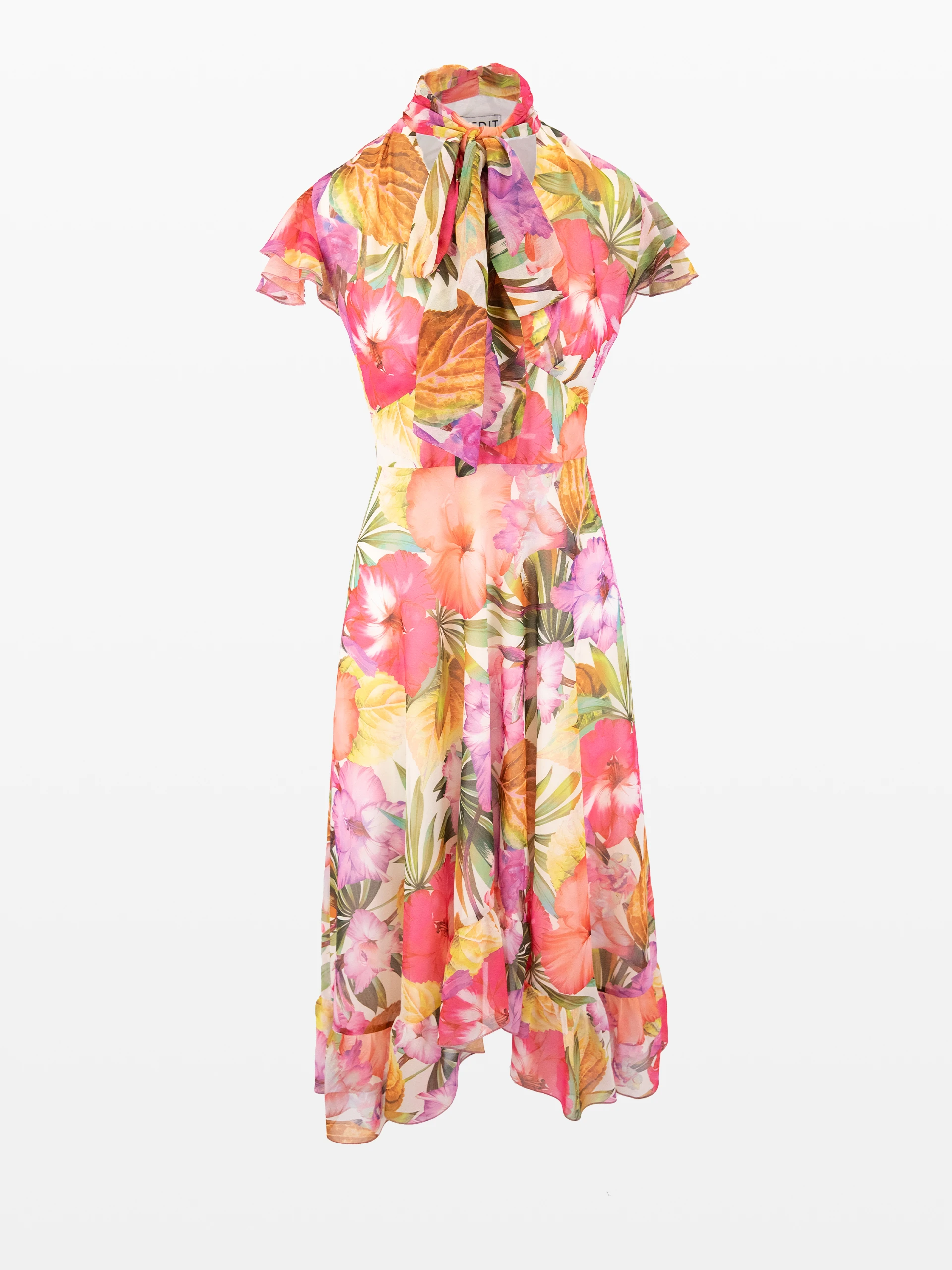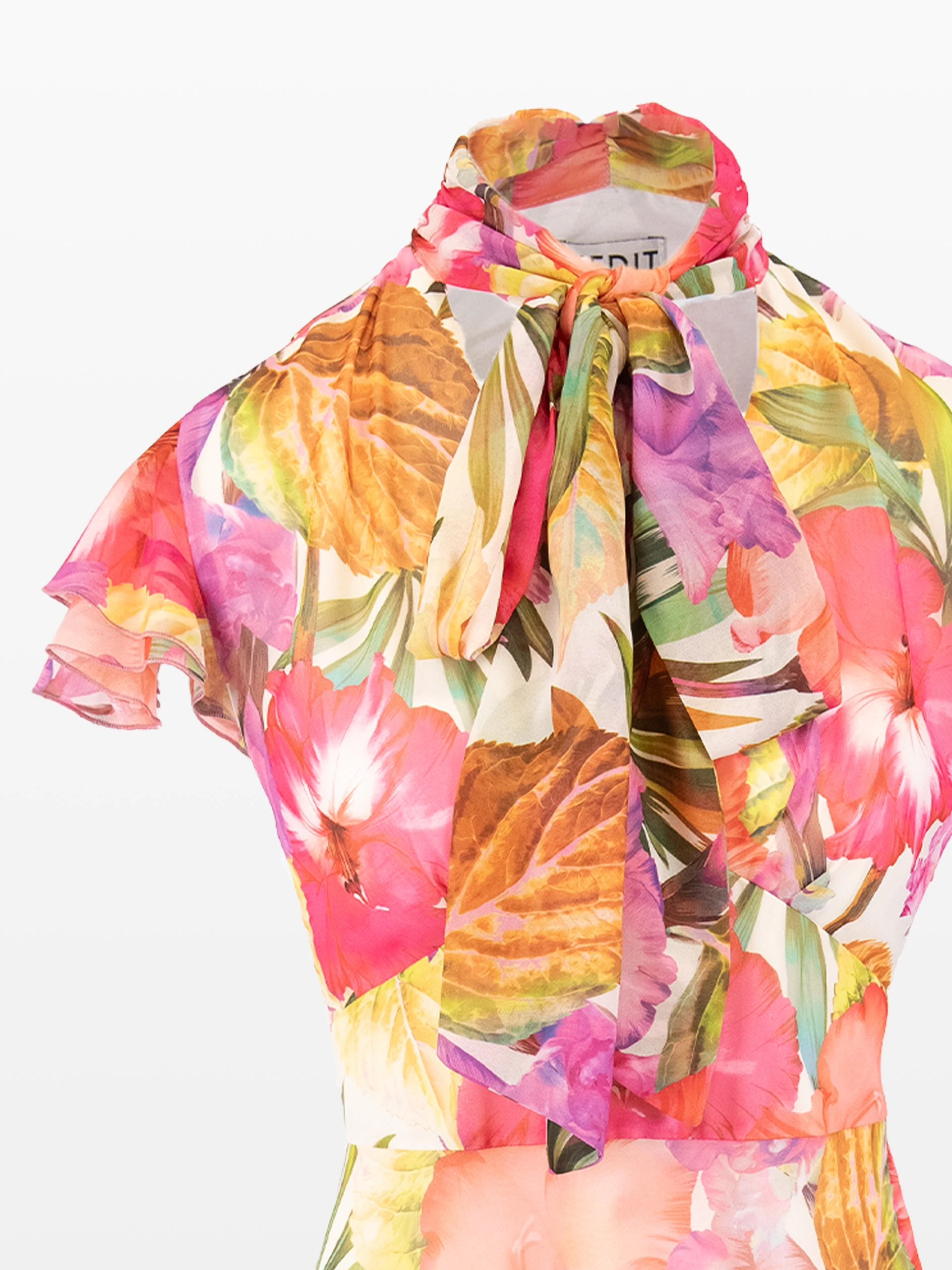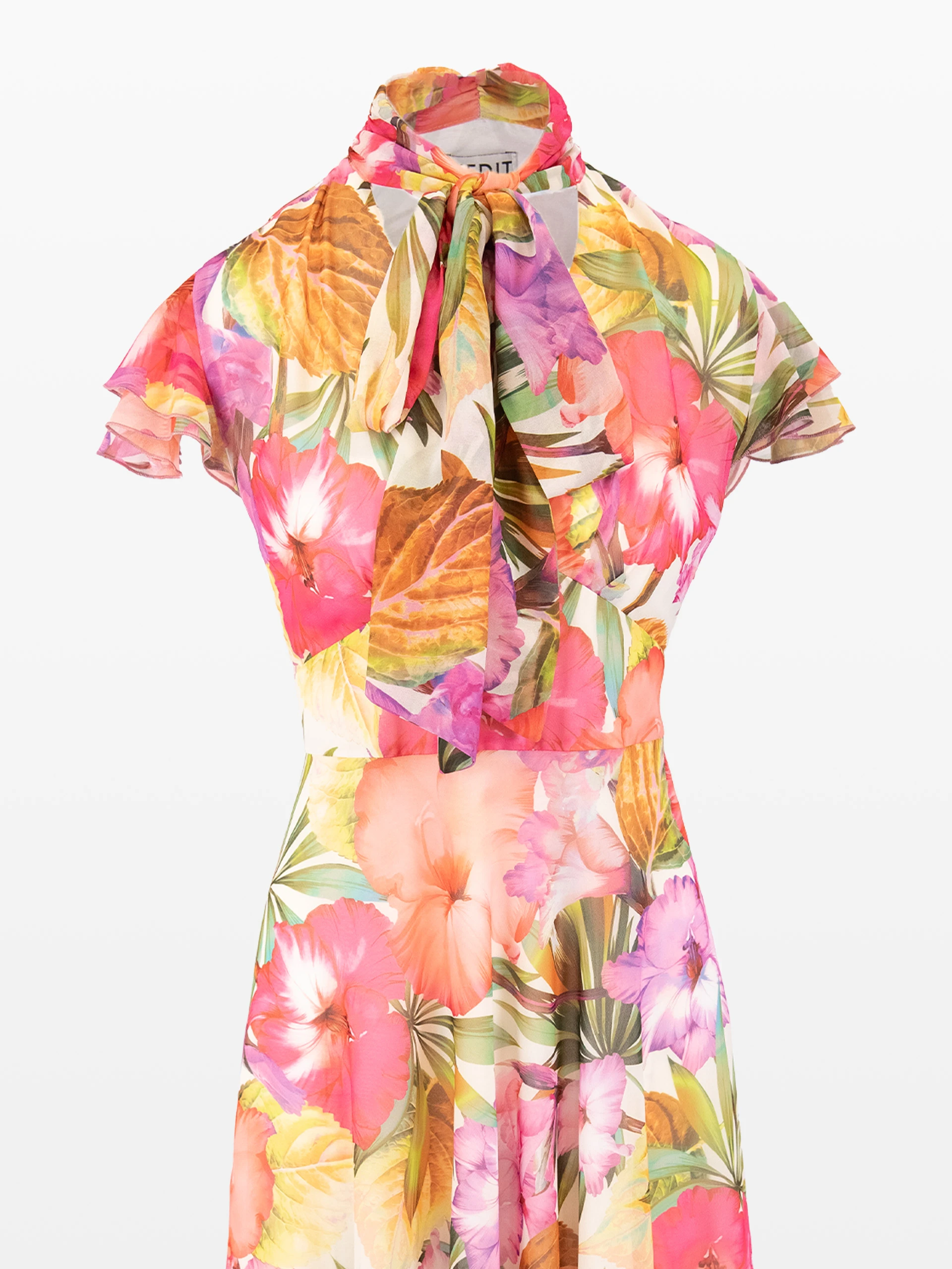 Rochie de vară cu print floral colorat, cu eșarfă.