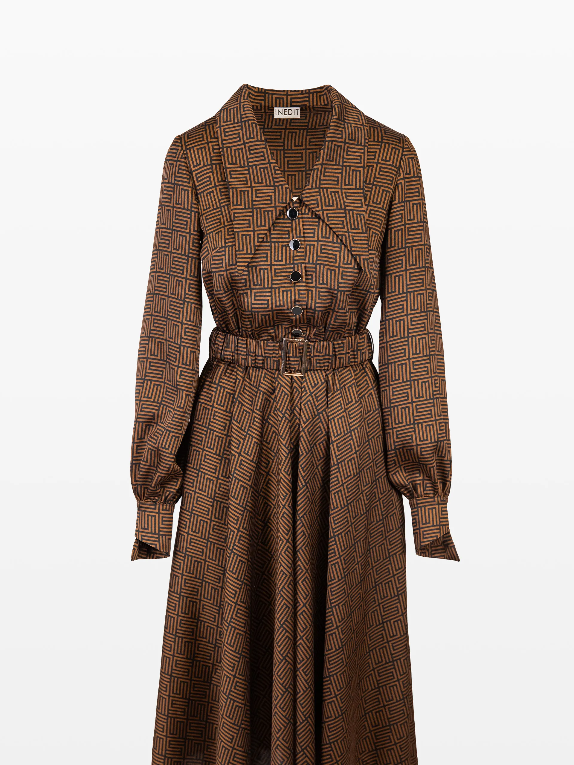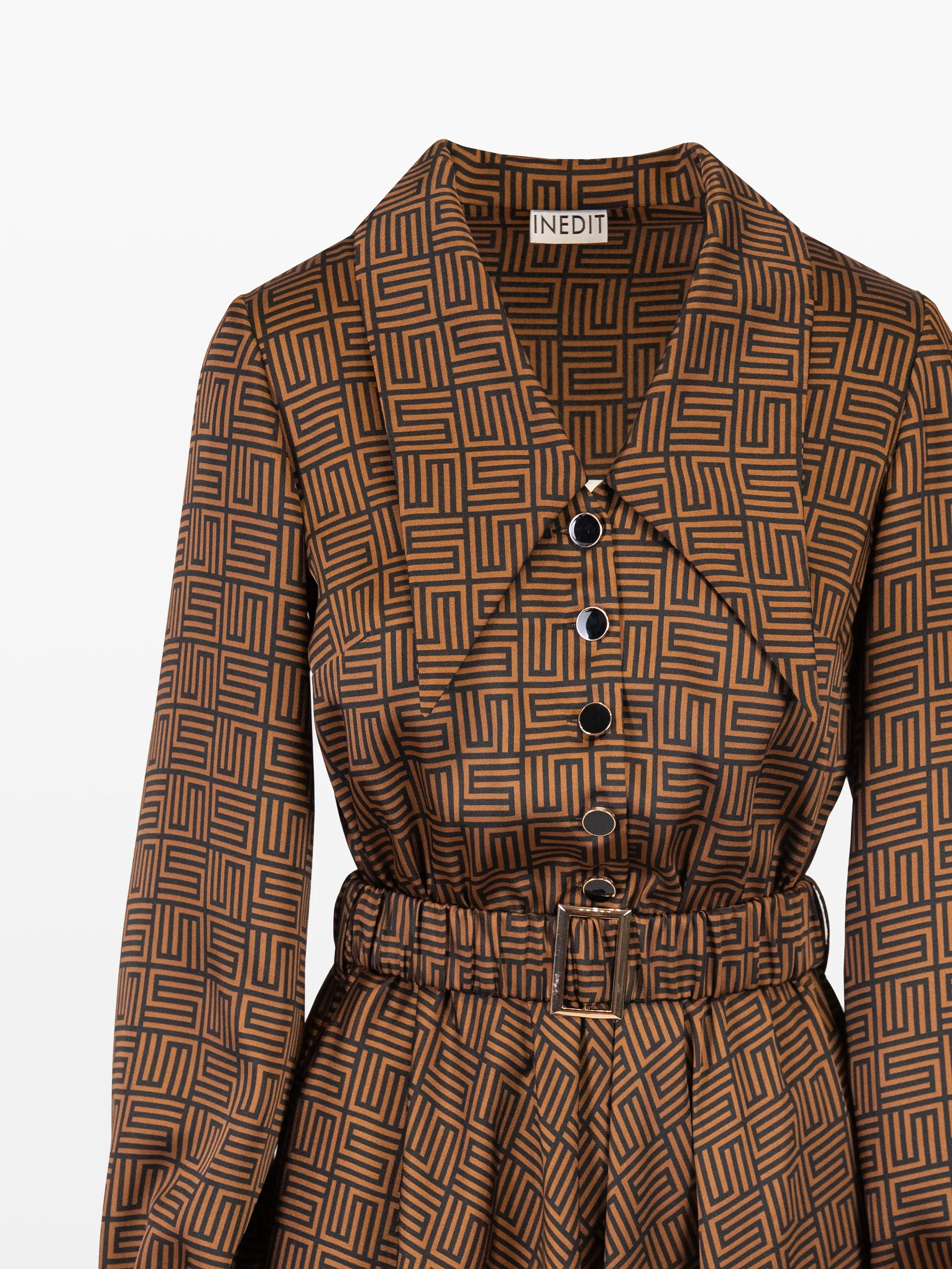 Rochie print geometric, guler supradimensionat cu cordon și cataramă aurie.