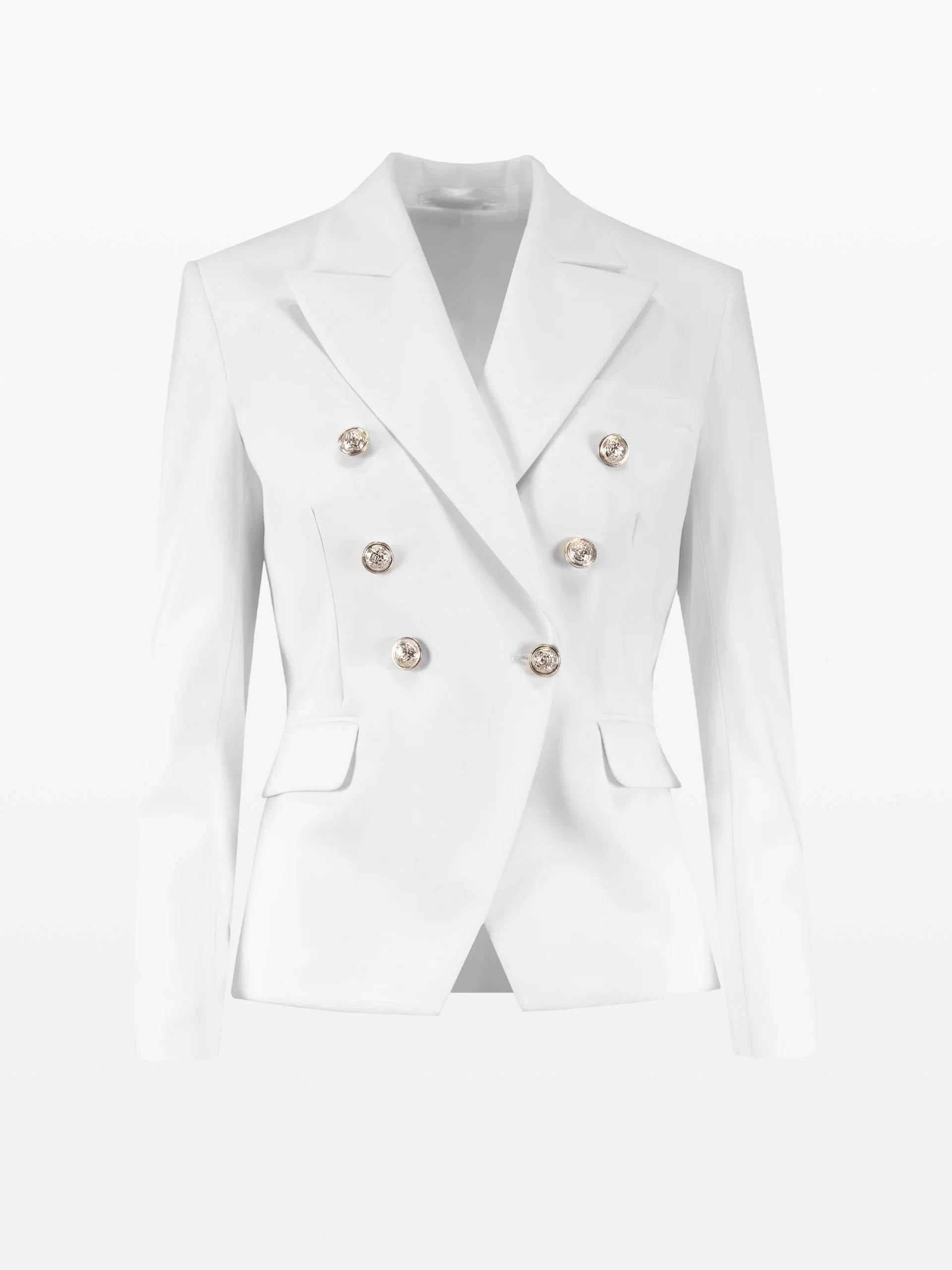 Sacou alb cu 2 rânduri de nasturi aurii.